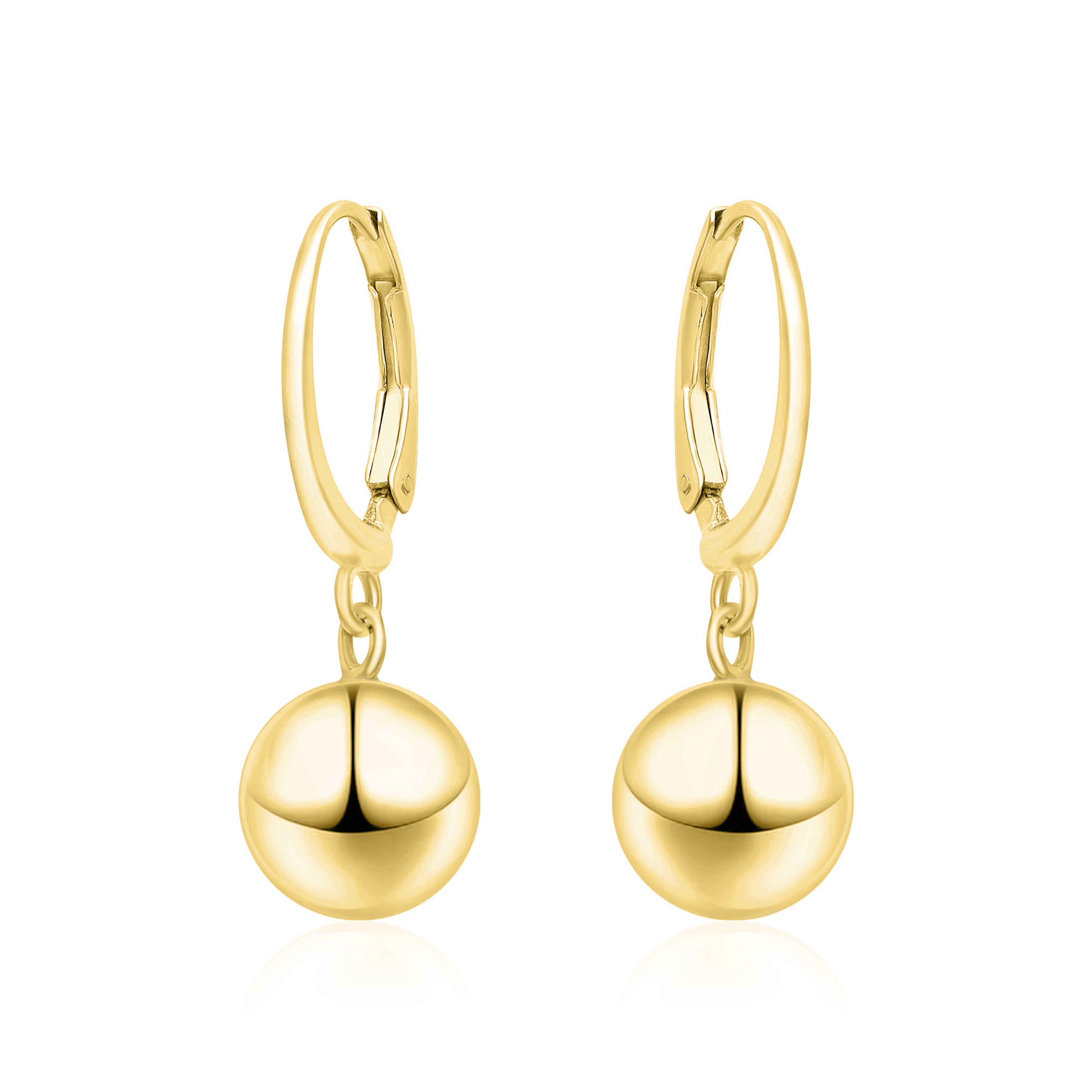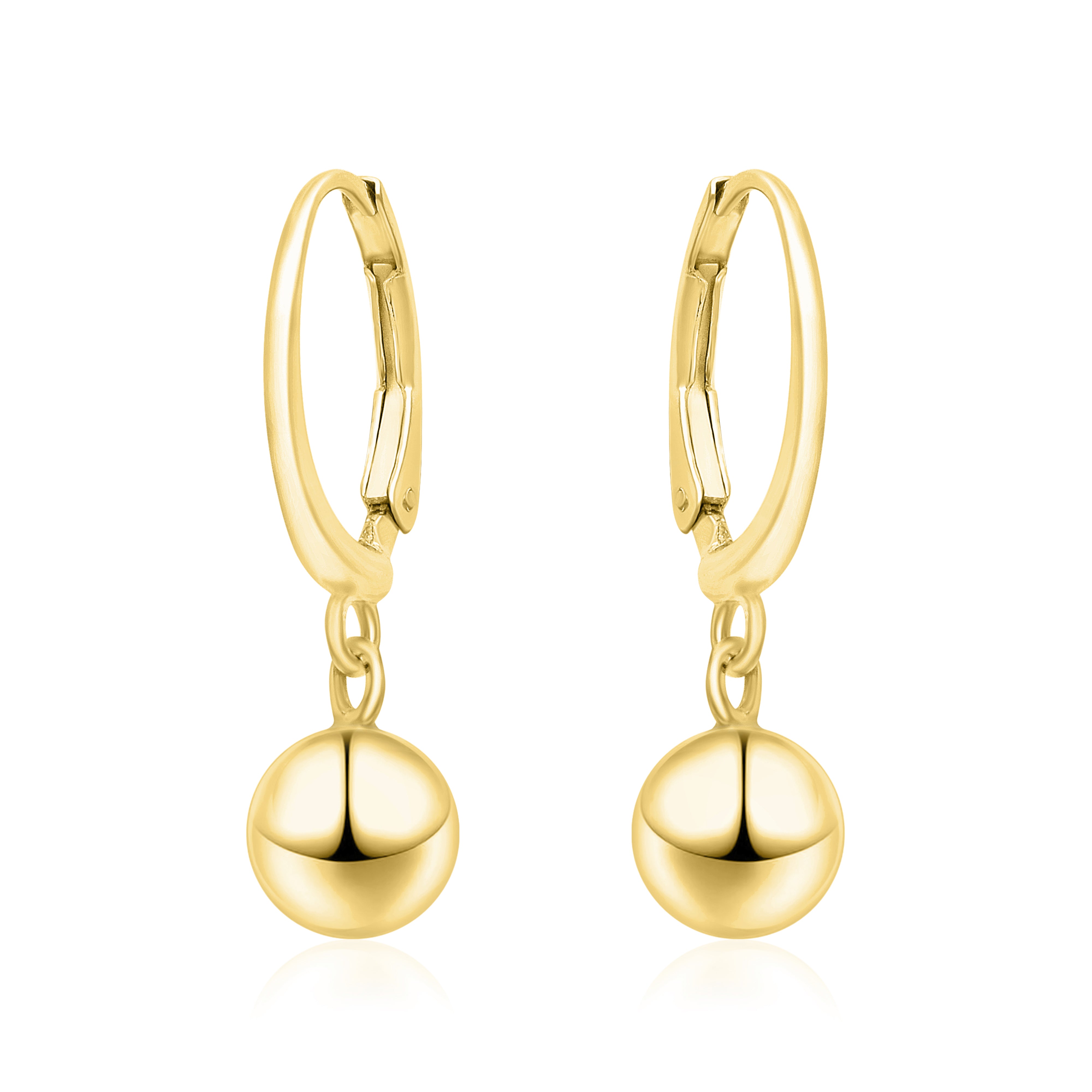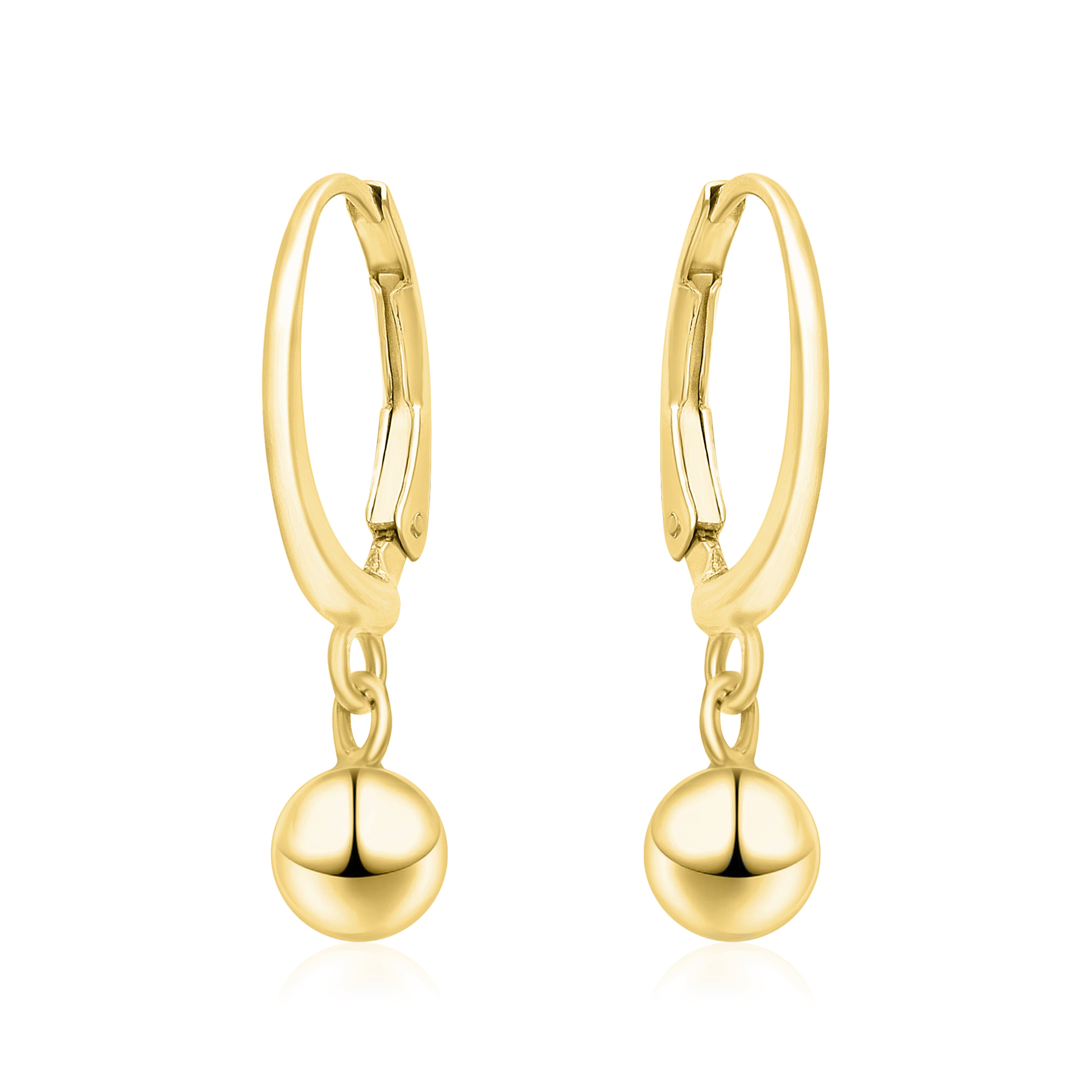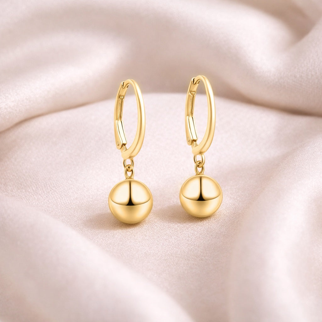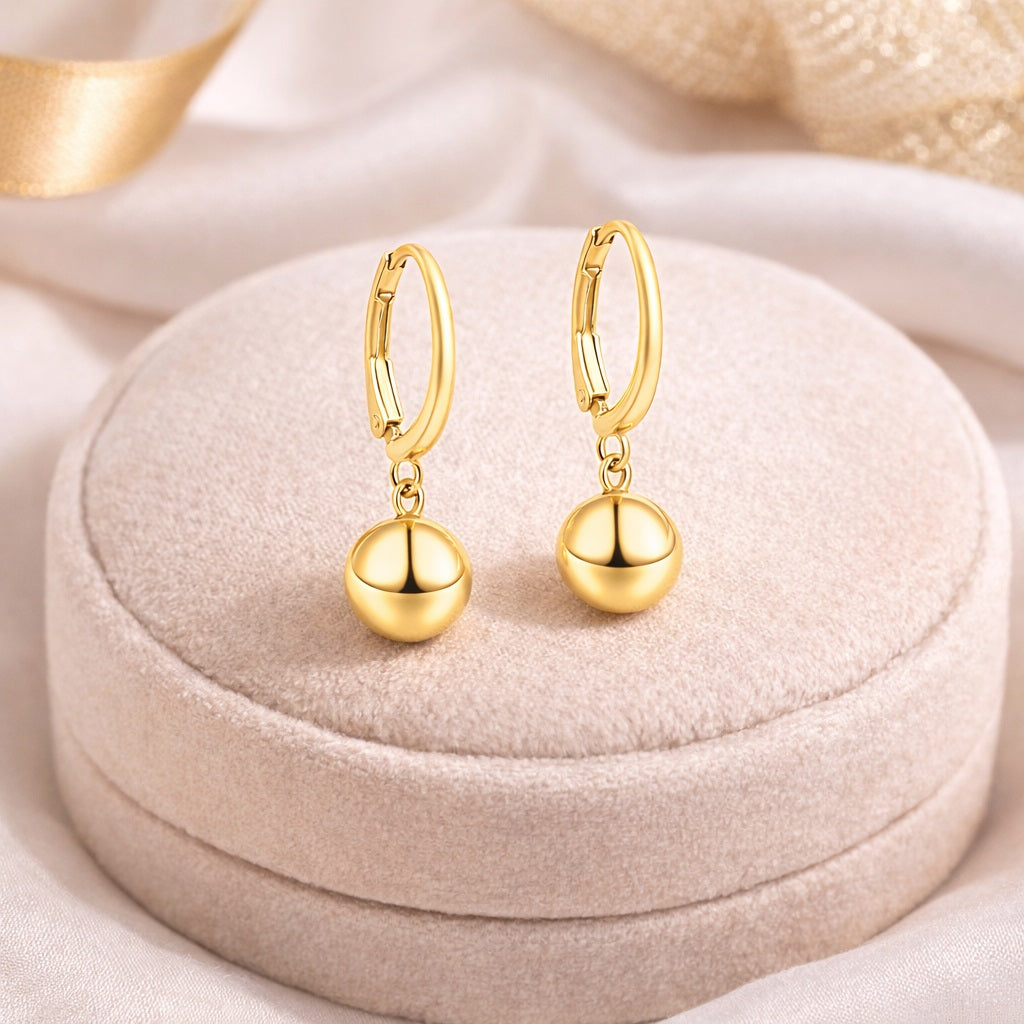 These graceful hoop earrings are crafted from solid 925 sterling silver and finished with a rich gold plating for a warm, radiant shine. The sleek hinged hoops feature a smooth dangling ball accent that adds subtle movement and sophistication. Lightweight and comfortable, they are perfect for daily wear, office styling, or as a refined minimalist gift.