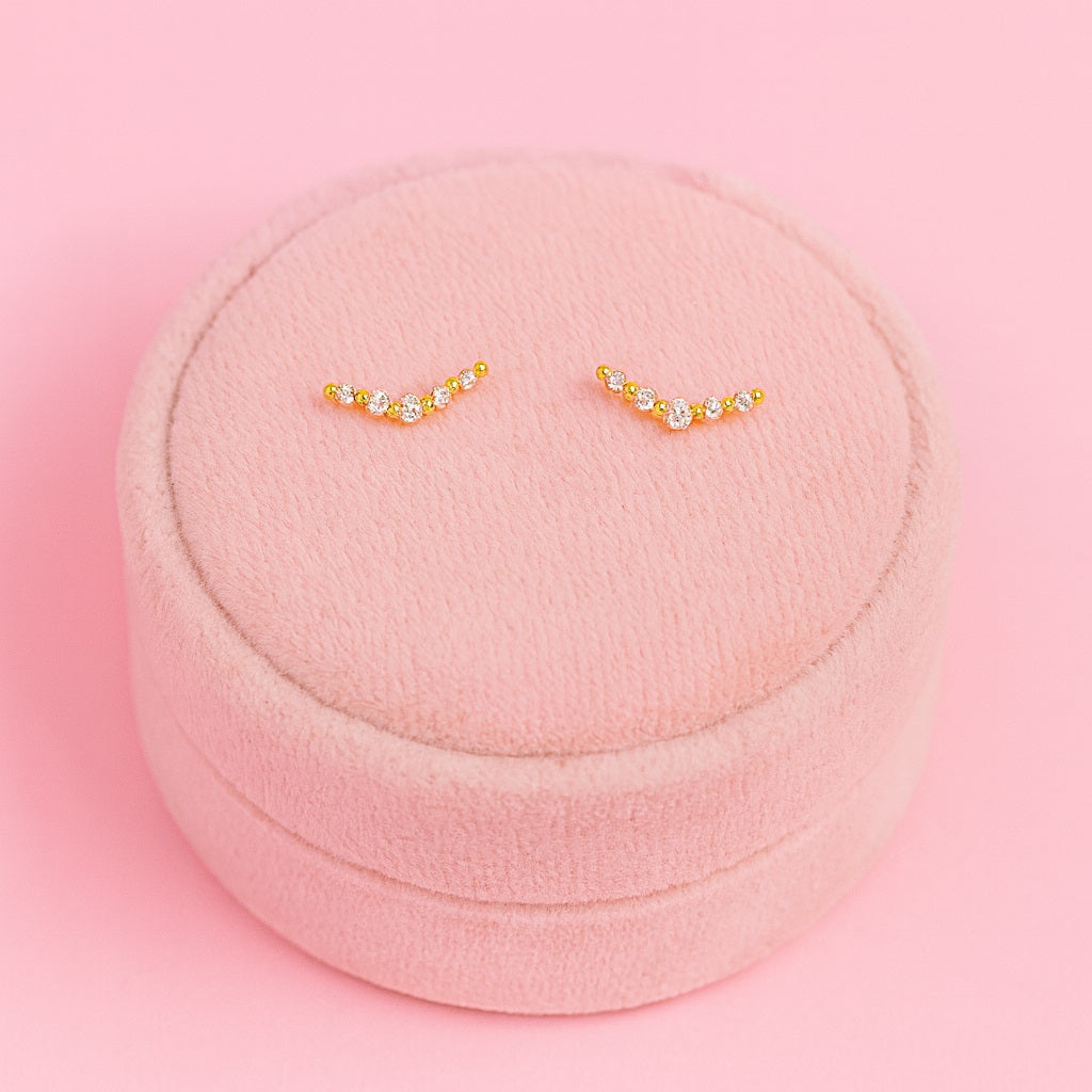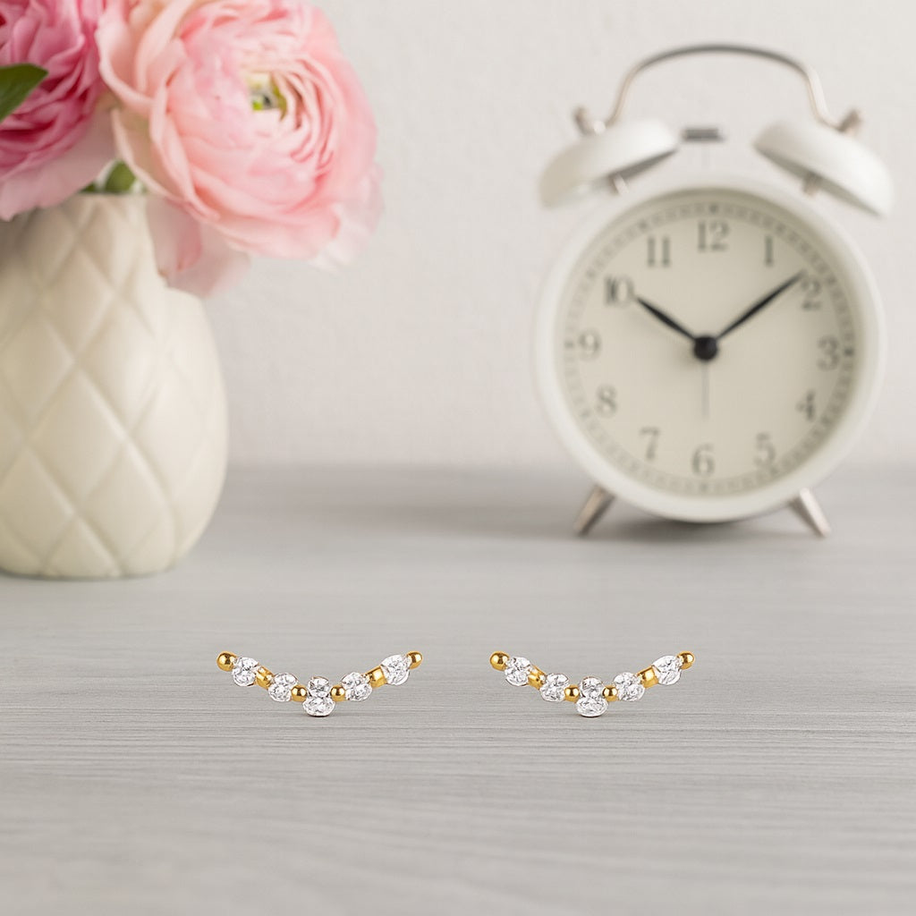 Add a hint of sparkle to your look with these V-shaped cluster stud earrings, featuring a graceful arrangement of cubic zirconia stones. Crafted in 925 sterling silver with radiant gold plating, these minimal yet striking earrings are perfect for daily wear or special occasions. Their curved silhouette beautifully hugs the earlobe for a refined and feminine touch.