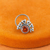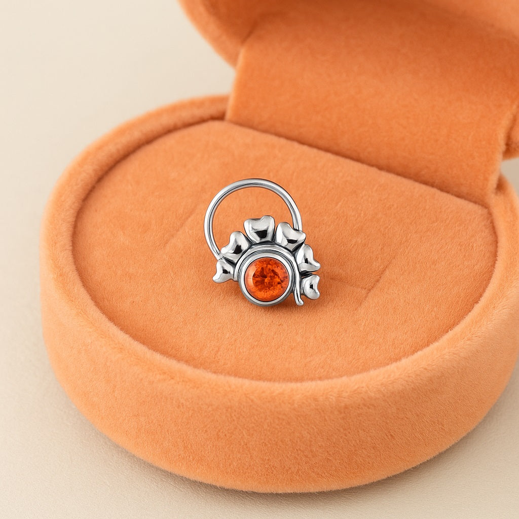 Brighten your style with this handcrafted nose pin made from 925 oxidized sterling silver, centered with a vivid orange citrine stone. The circular bezel is flanked by delicate heart-leaf elements, adding a whimsical, nature-inspired flair. Perfect for earthy souls and those drawn to symbolic gemstone jewelry.