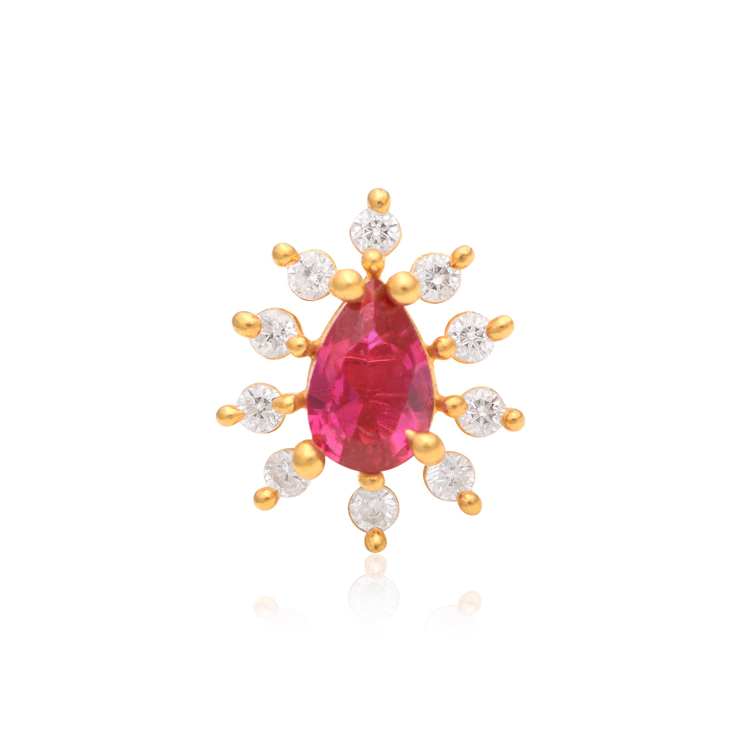 Capture attention with this radiant teardrop-shaped red CZ nose pin, framed by a sparkling halo of white CZ stones. Set in gold-plated 925 sterling silver, the intricate floral design adds elegance and allure, making it a stunning choice for weddings and celebratory events.