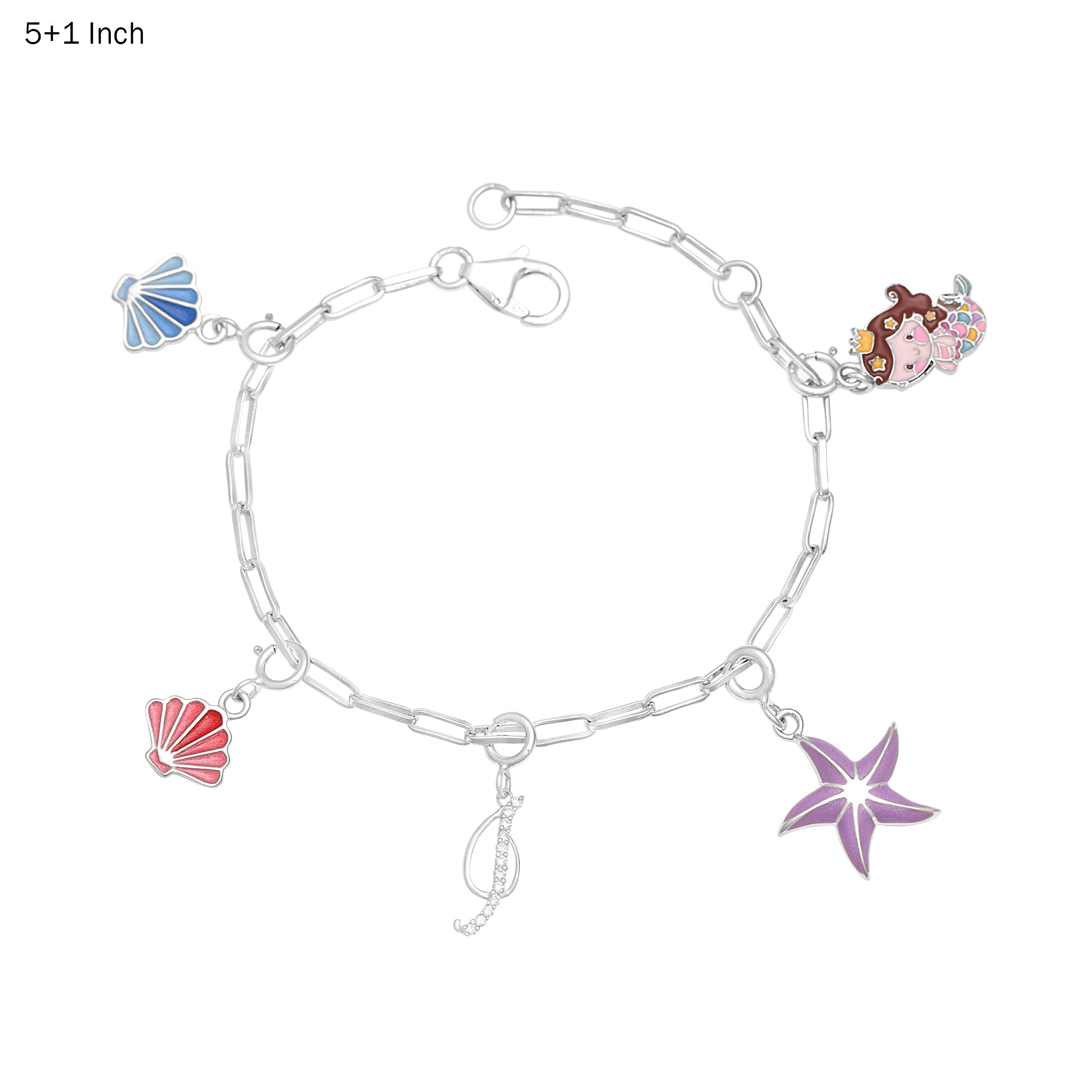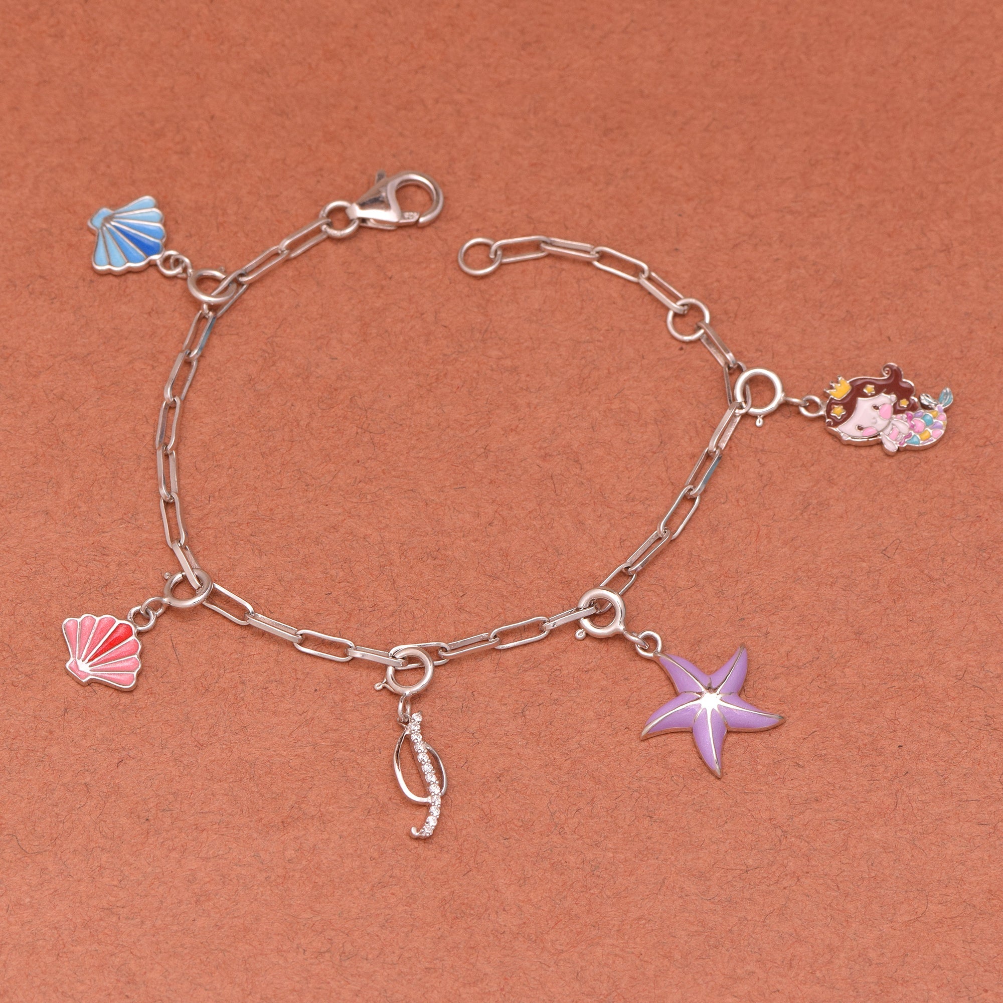 Add a playful and personal touch to your child’s accessory collection with this adorable ocean-themed charm bracelet. Featuring a delightful enamel mermaid, seashells, starfish, and a sparkling letter “J” charm, all crafted in solid 925 sterling silver, this piece combines fun, color, and sentiment in one perfect gift. Secured with a lobster clasp and ready to wear.