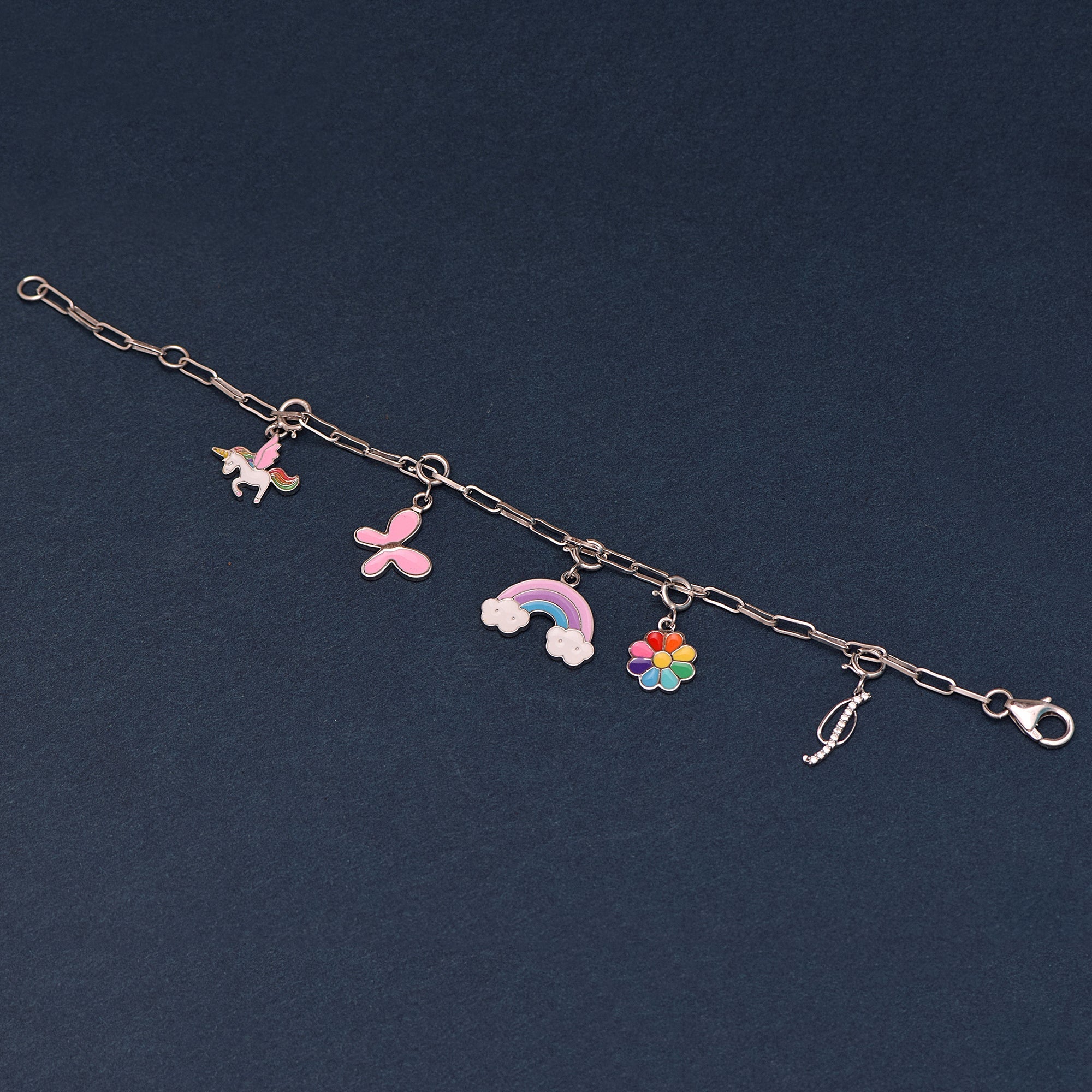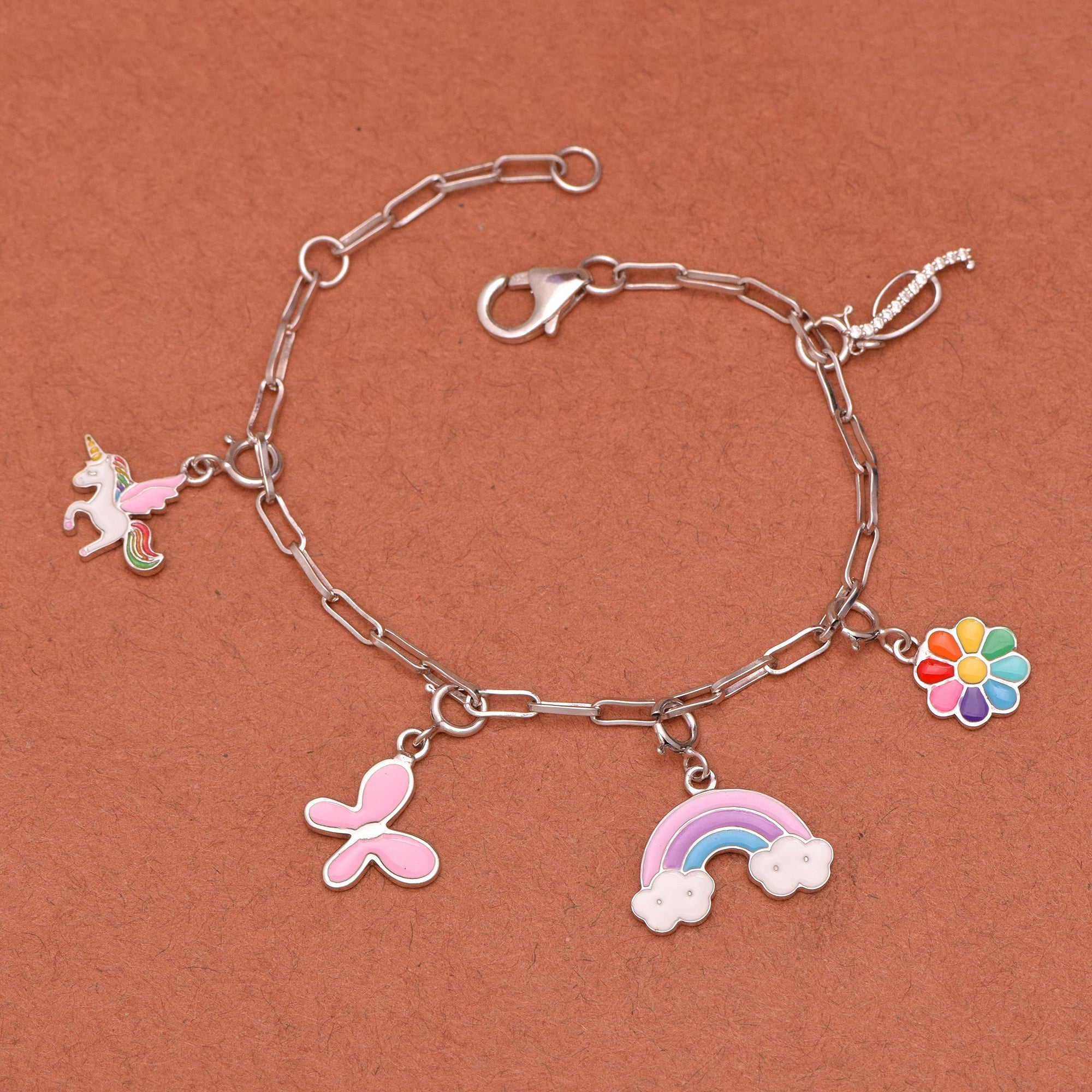 Bring dreams to life with this colorful charm bracelet featuring a unicorn, rainbow, butterfly, flower, and sparkling initial ‘J’ charm. Designed in solid 925 sterling silver with vibrant enamel accents, this playful piece is perfect for little girls who love magic and color. The adjustable chain ensures a comfortable fit and a secure lobster clasp keeps it safe all day.