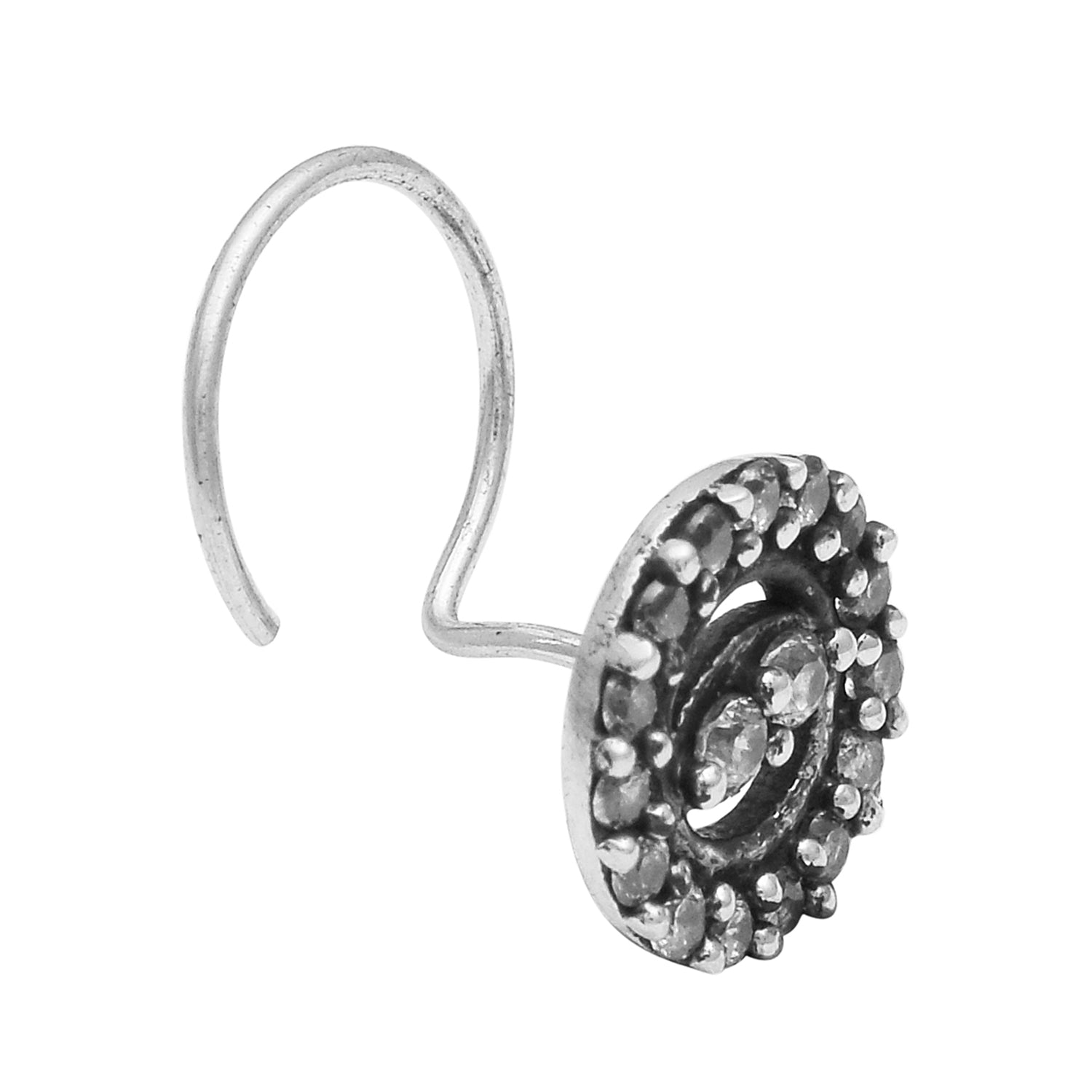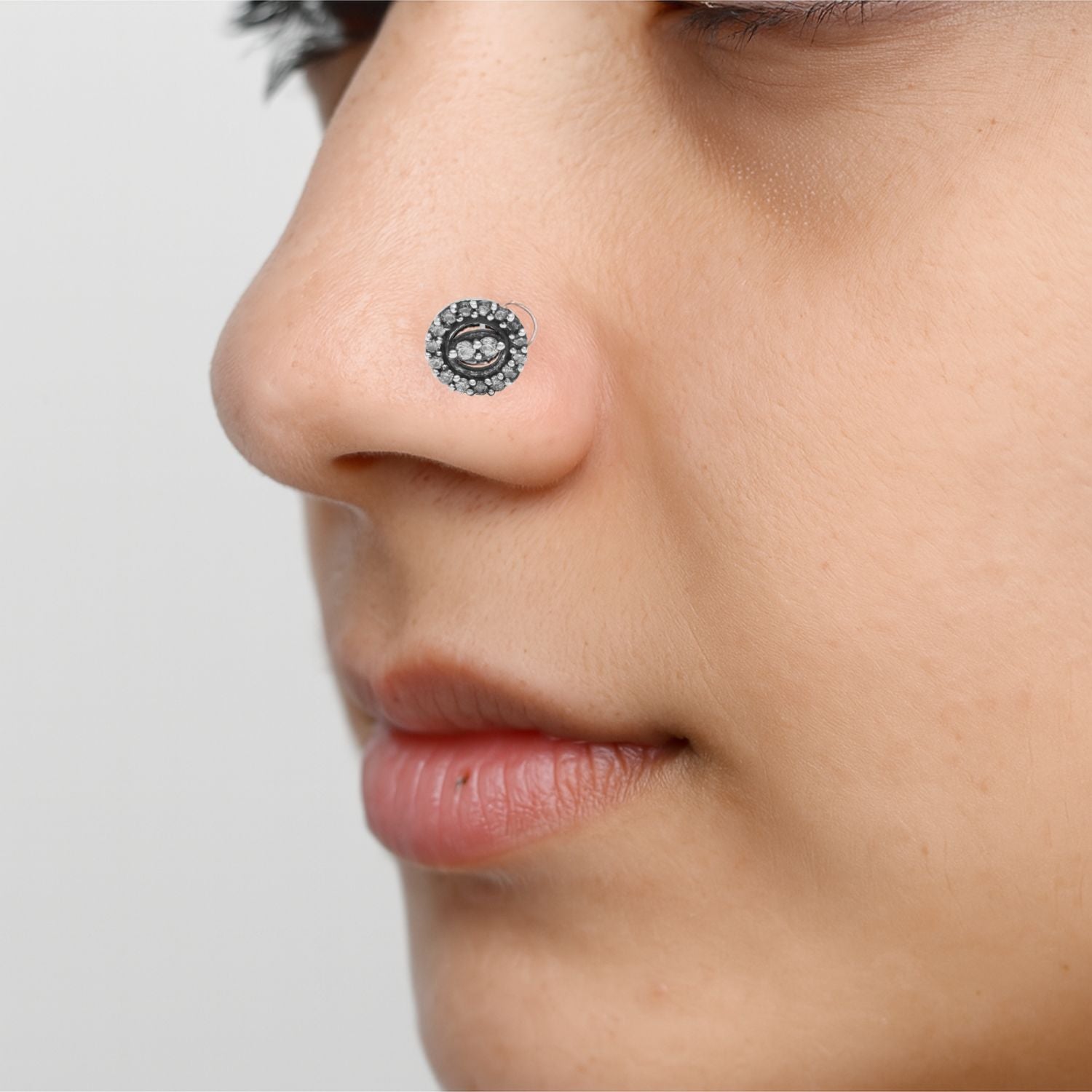 Featuring an artistic open circle design, this oxidized sterling silver nose pin is adorned with a sparkling array of white cubic zirconia. Its intricate cutwork and dual-layer cluster pattern give it a unique look that beautifully blends traditional charm with a modern twist.
