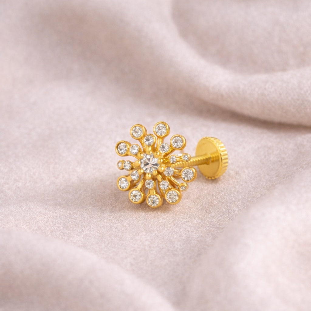 Add radiant charm to your everyday look with this beautifully crafted floral nose pin featuring a dazzling sunburst cluster of white cubic zirconia stones. Set in solid 925 sterling silver with a rich gold-plated finish, the intricate round design creates a bold yet graceful statement. Perfect for festive wear, weddings, or daily elegance, this nose pin blends classic Indian aesthetics with contemporary finesse.