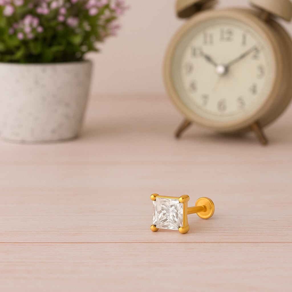 Elevate your everyday style with this stunning princess-cut solitaire nose pin, meticulously crafted in 925 sterling silver and finished with a rich layer of gold plating. The square white CZ stone is secured in a sleek four-prong setting, creating a radiant and sophisticated look that pairs effortlessly with both traditional and modern outfits.