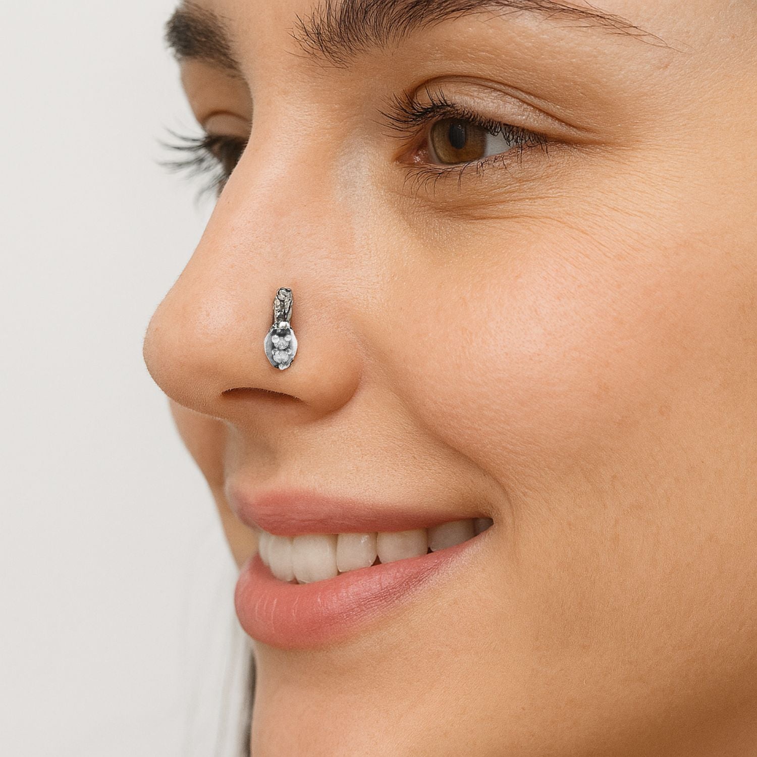 Add a subtle sparkle to your everyday look with this delicate nose pin crafted in solid 925 sterling silver. Featuring a cluster of white gemstones arranged in a tiny floral motif, it beautifully enhances your natural elegance. The minimal design is perfect for daily wear, offering just the right hint of shimmer whether you pair it with casual outfits or traditional attire.