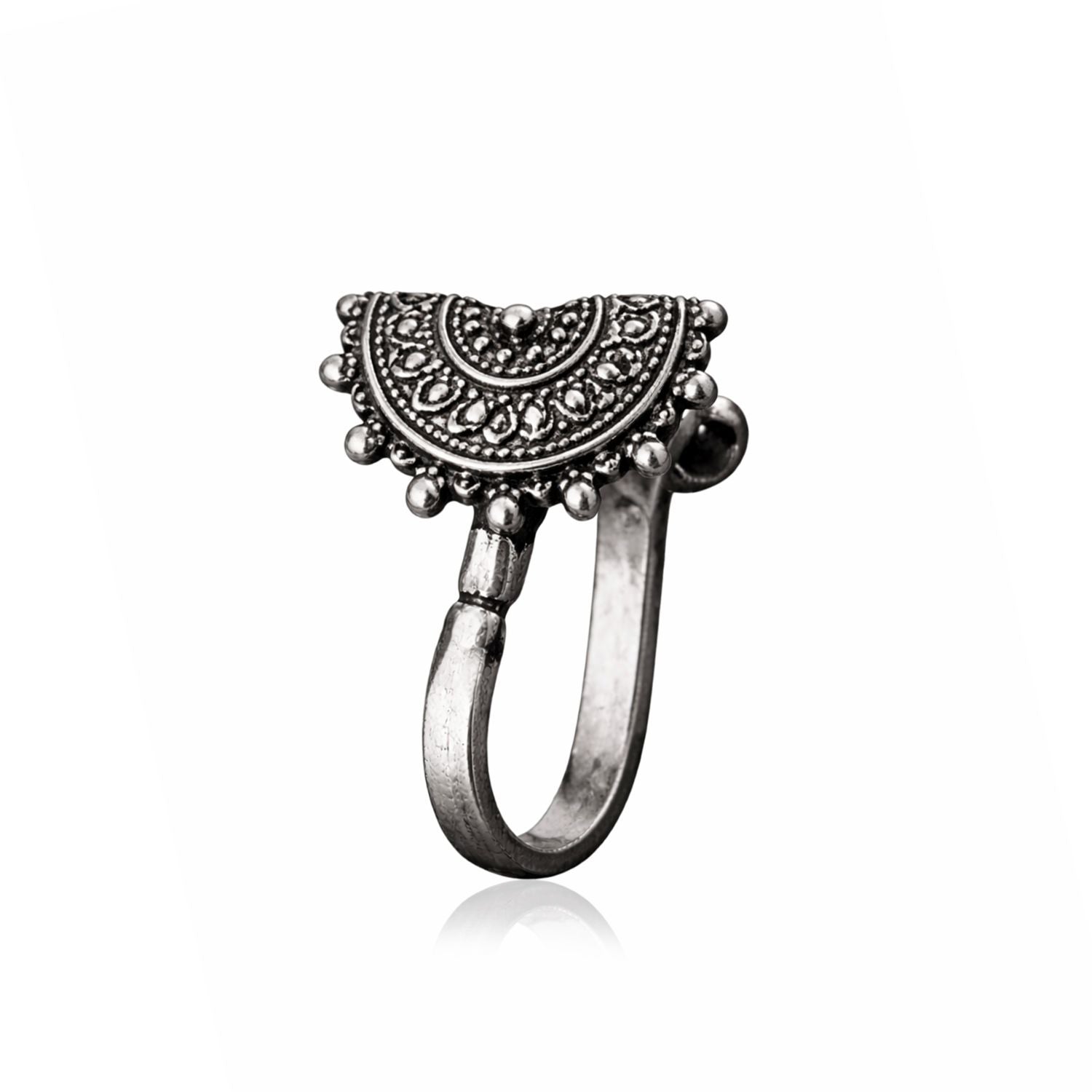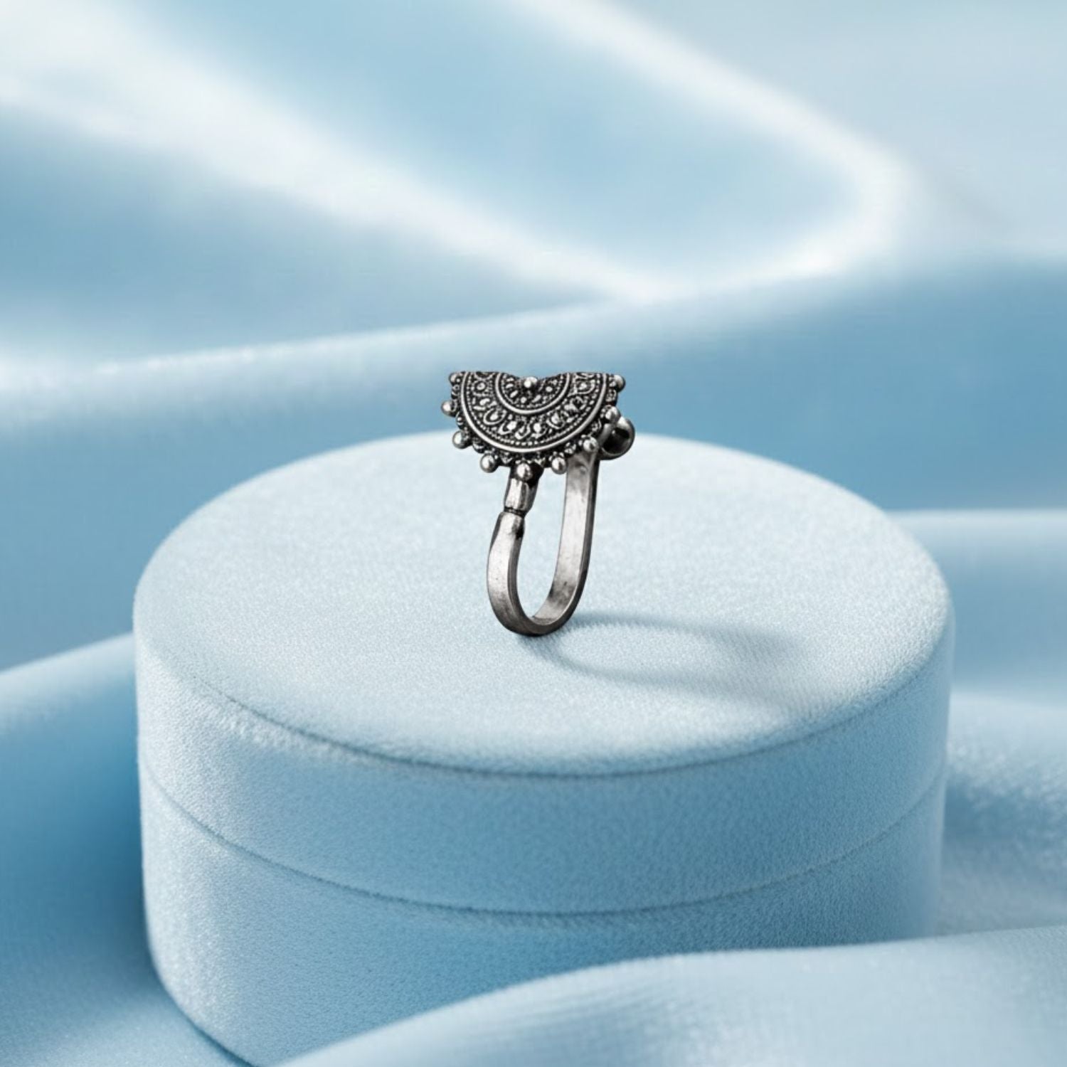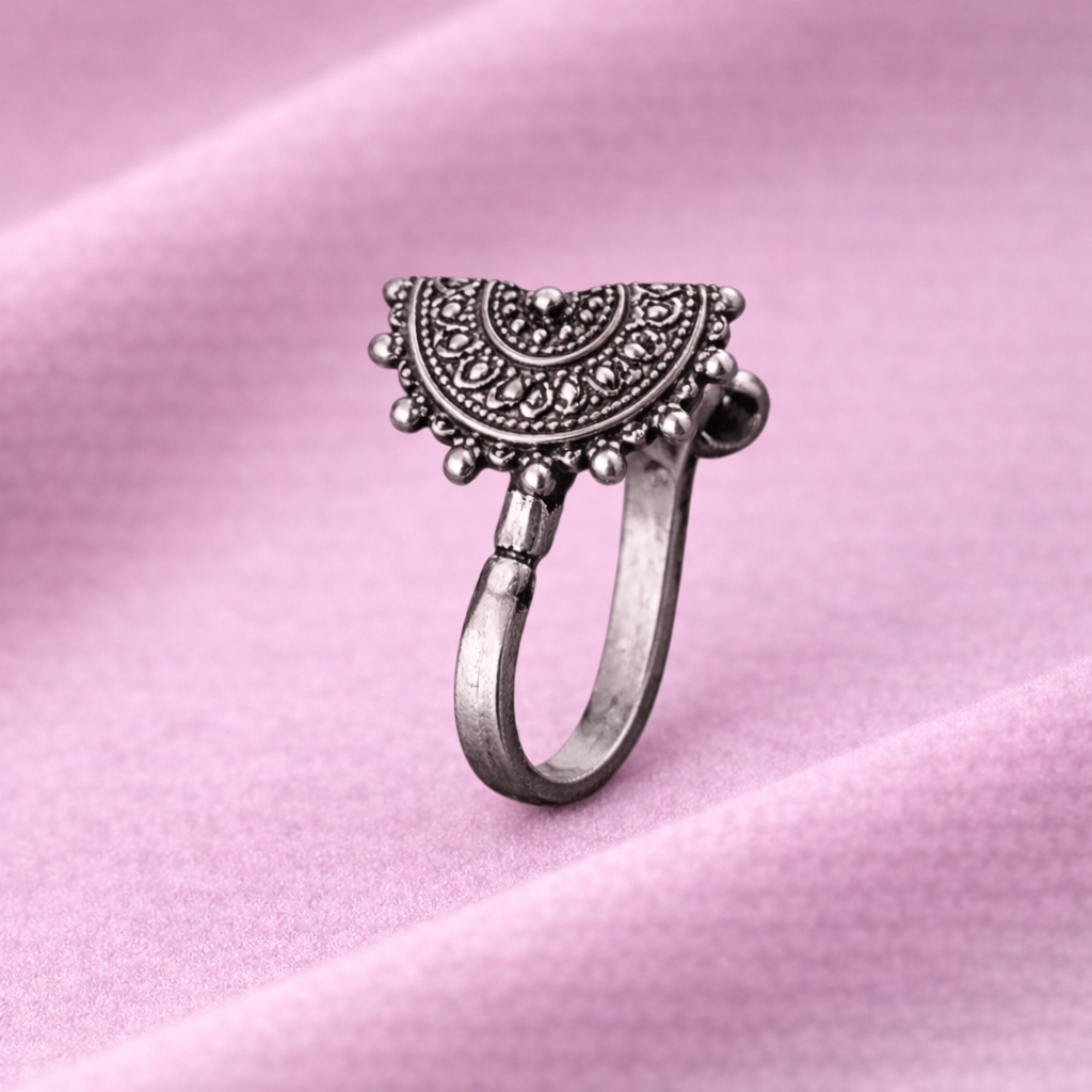 This beautifully crafted oxidized nose pin is made from genuine 925 sterling silver and features a traditional half-moon mandala design. The intricate dotted detailing and antique finish highlight its handcrafted appeal, while the decorative beaded edging adds a rich ethnic touch. With a smooth clip-on mechanism, it ensures comfortable wear for non-pierced users—perfect for festive, cultural, and everyday ethnic looks.