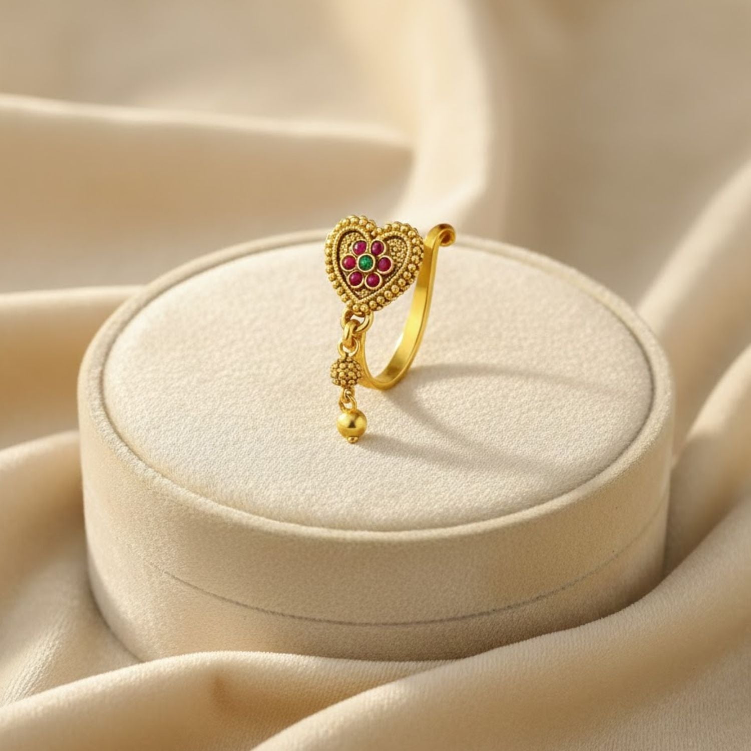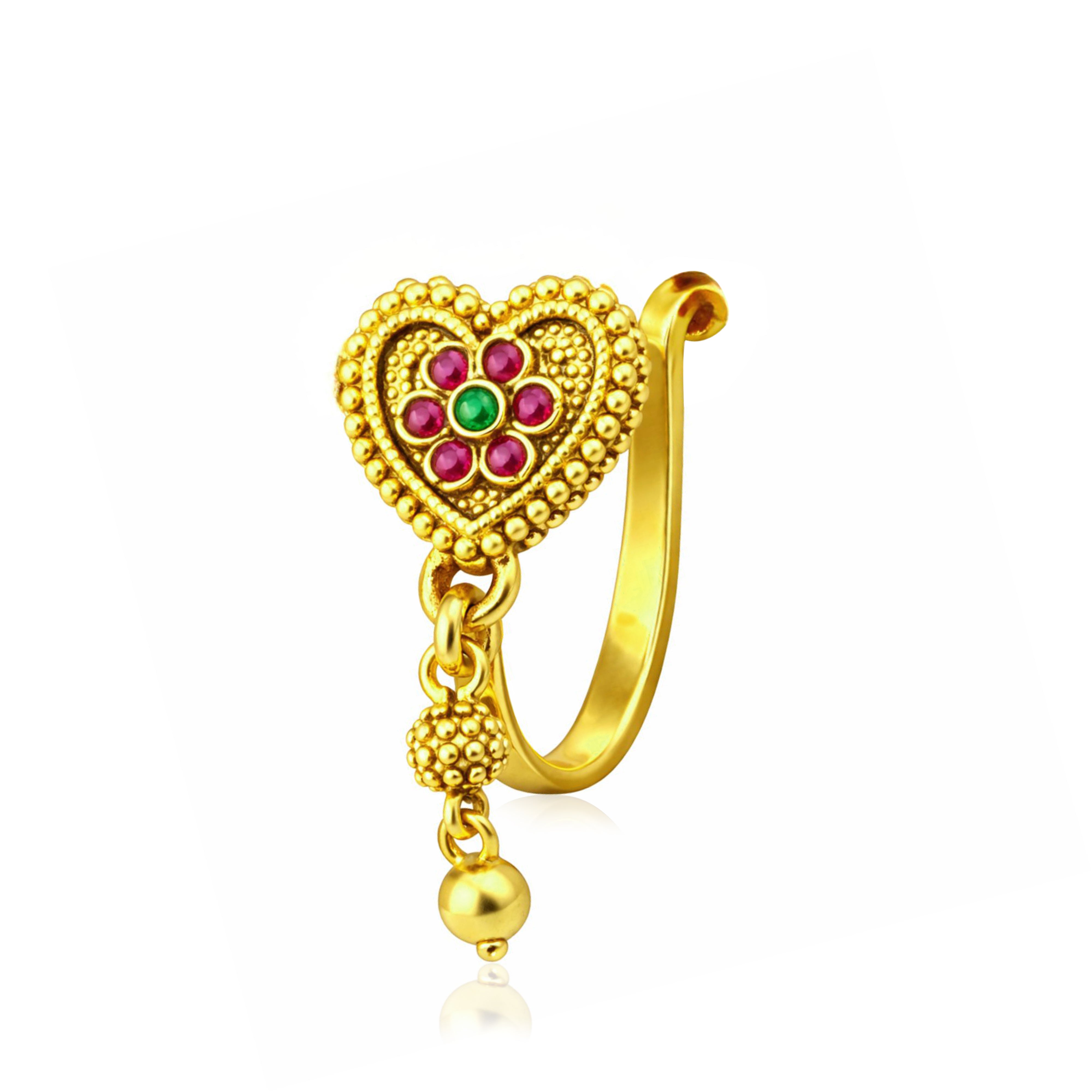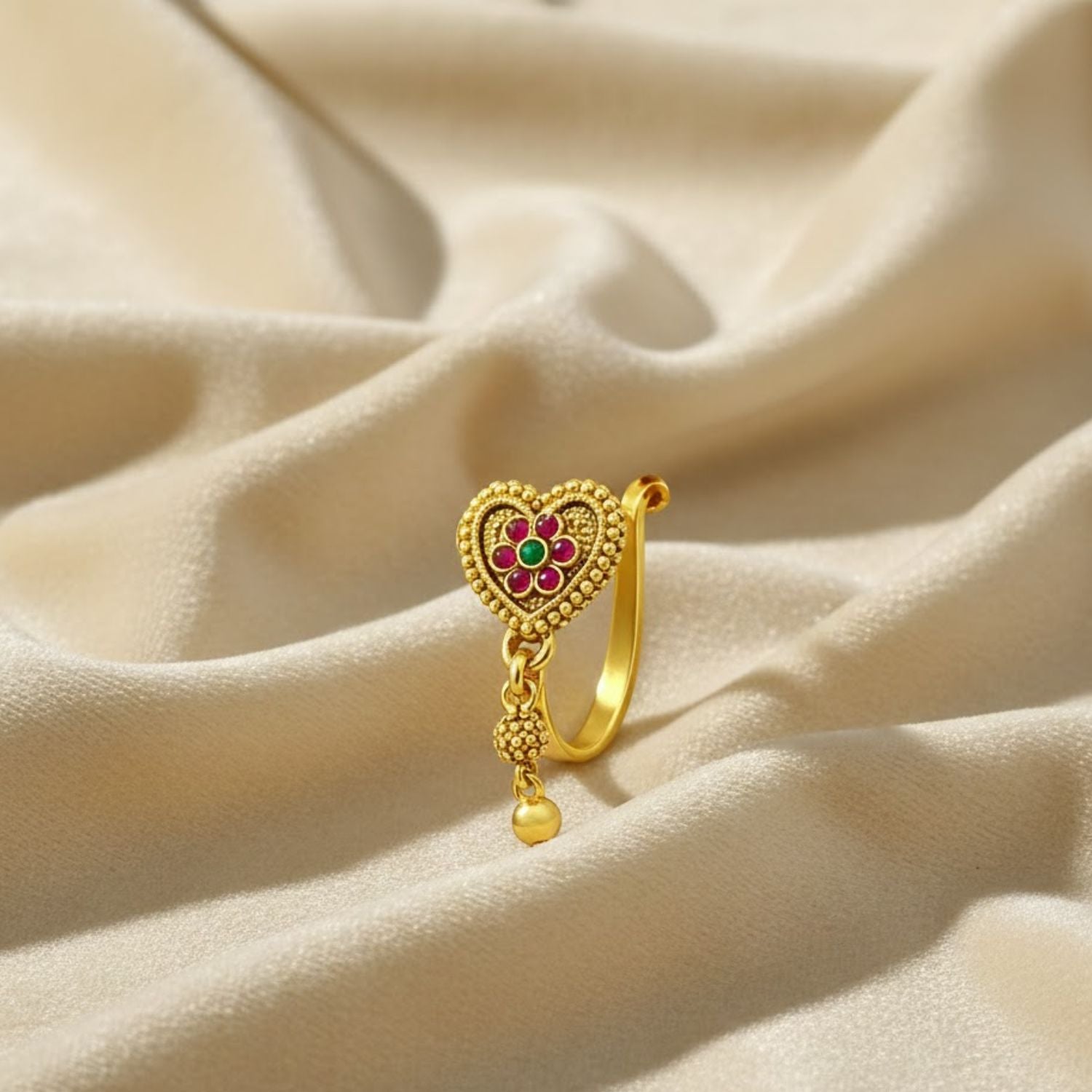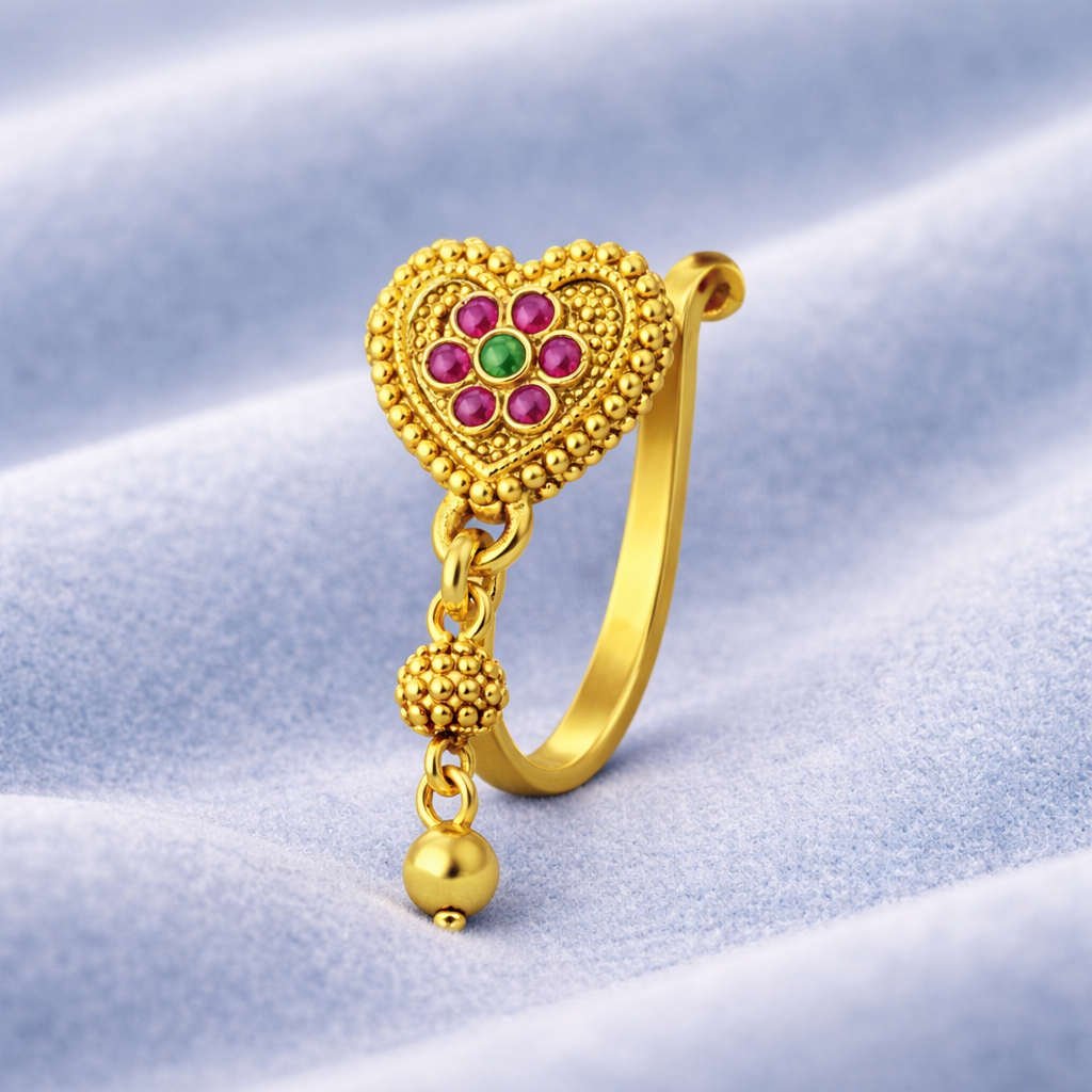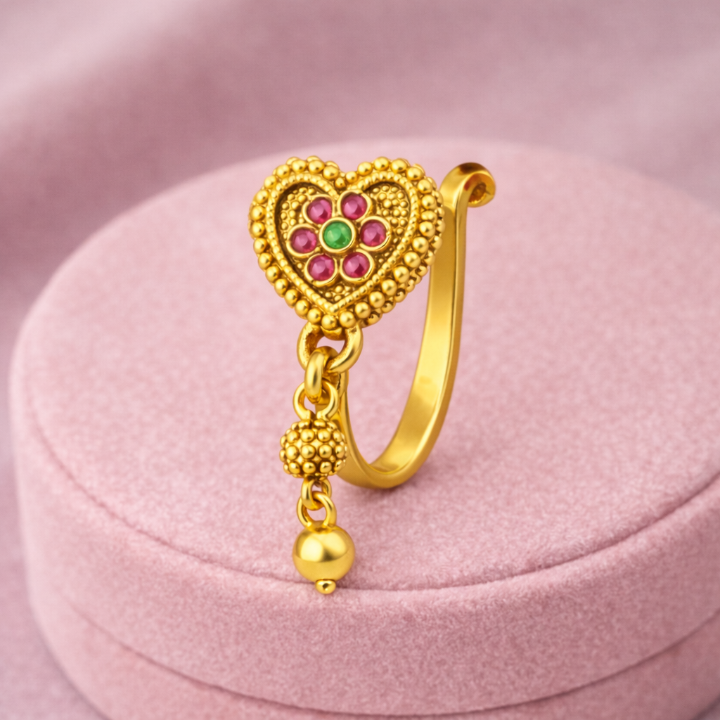 Crafted from solid 925 sterling silver with a radiant yellow gold plating, this elegant nose pin features a heart-shaped design adorned with delicate beaded detailing. The center showcases a floral arrangement of vibrant ruby-colored stones with a green accent, adding a rich traditional touch. Finished with a graceful dangling bead and a comfortable clip-on closure, this piece is ideal for non-pierced wearers seeking ethnic charm with a hint of color.