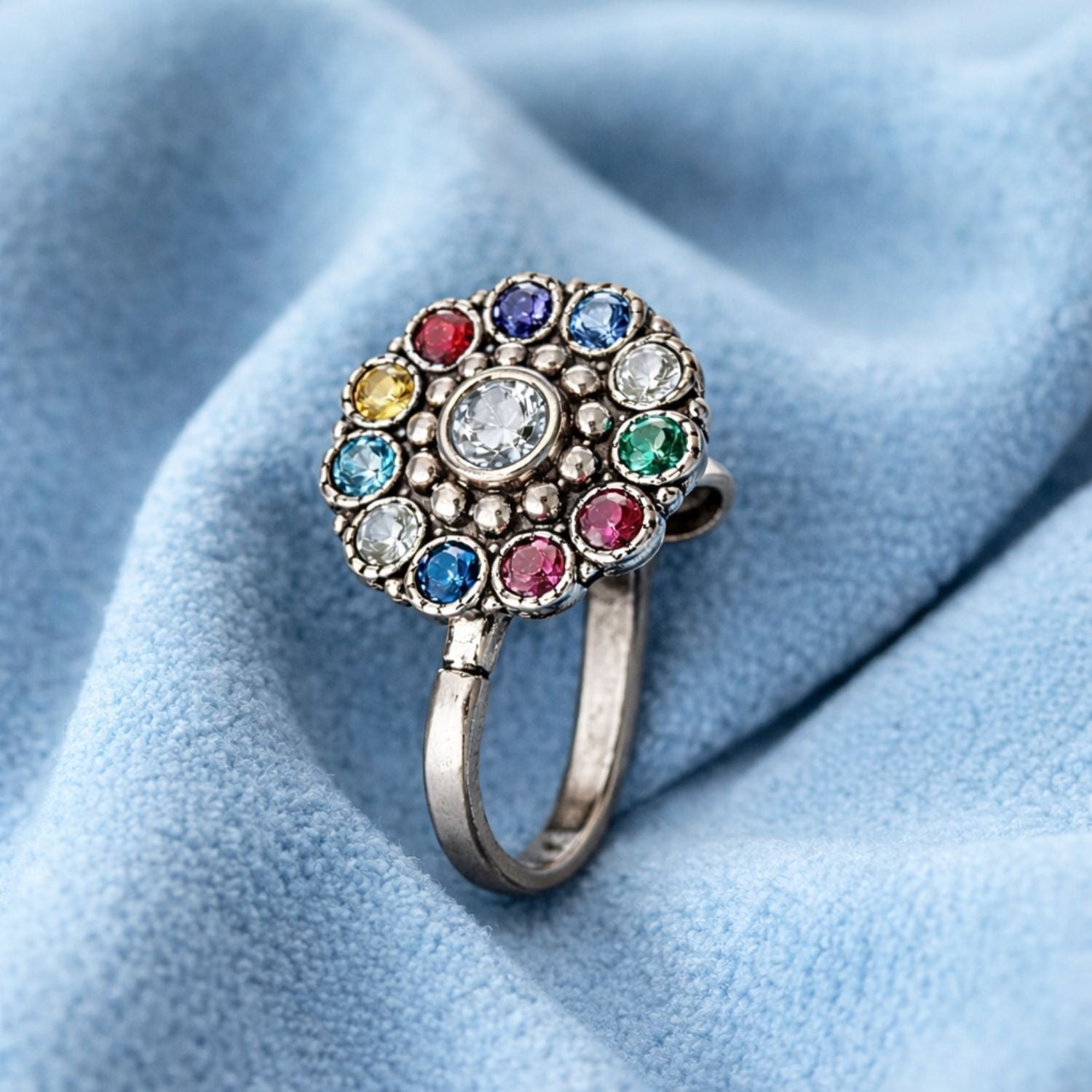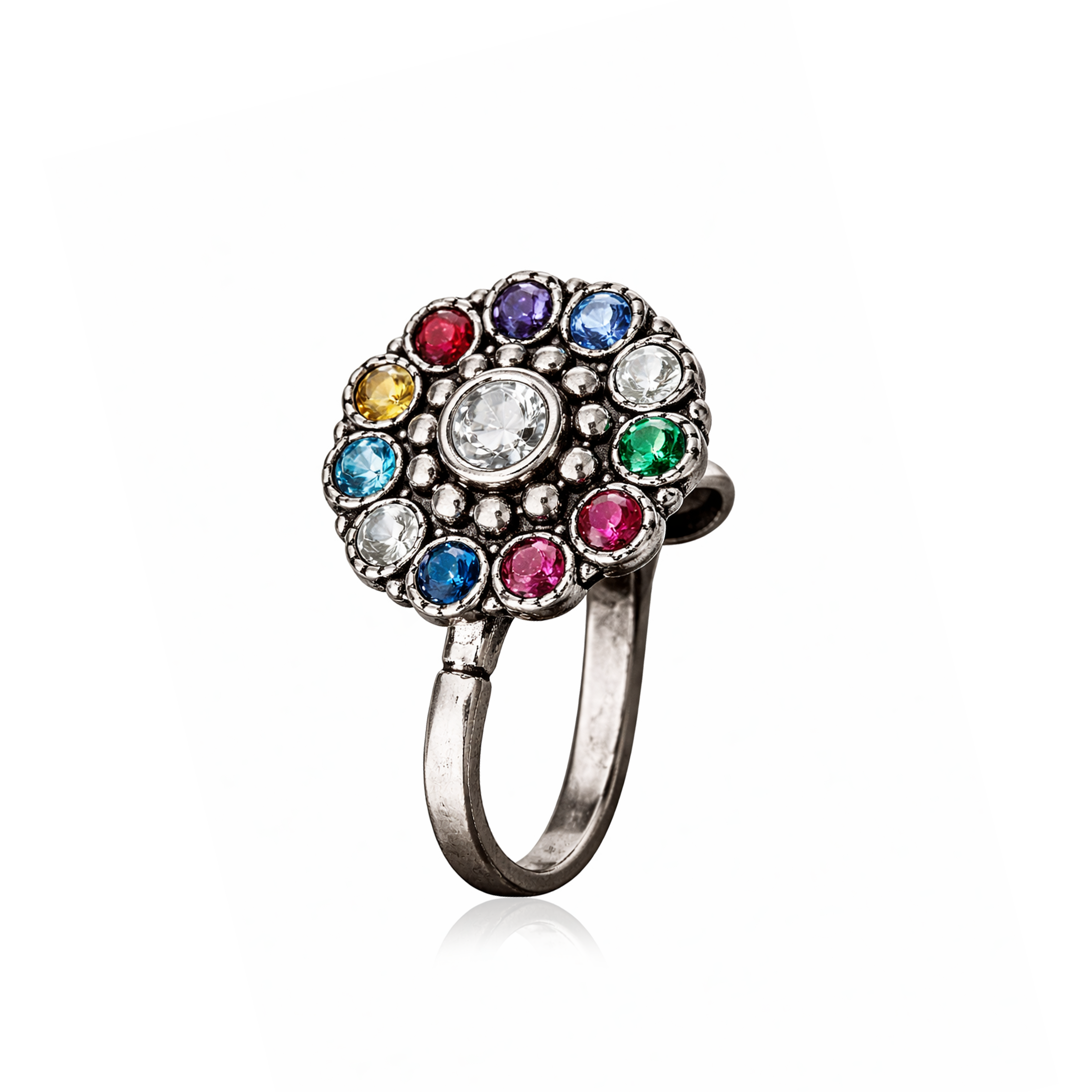 This beautifully handcrafted nose pin is made from genuine 925 sterling silver with an oxidized finish, featuring a classic round floral design inspired by traditional Navratna styling. A sparkling white CZ center is surrounded by vibrant multicolor cubic zirconia stones, symbolizing harmony and elegance. Finished with delicate beaded detailing and a secure clip-on closure, this piece is perfect for non-pierced wearers who appreciate timeless ethnic jewelry with a pop of color.