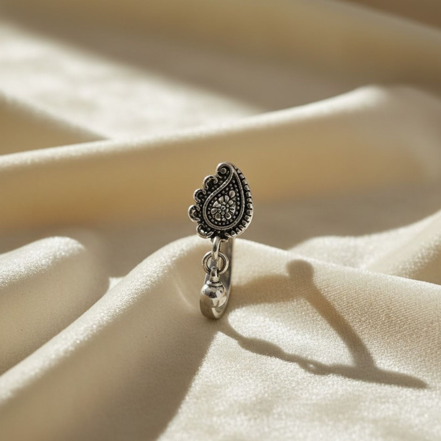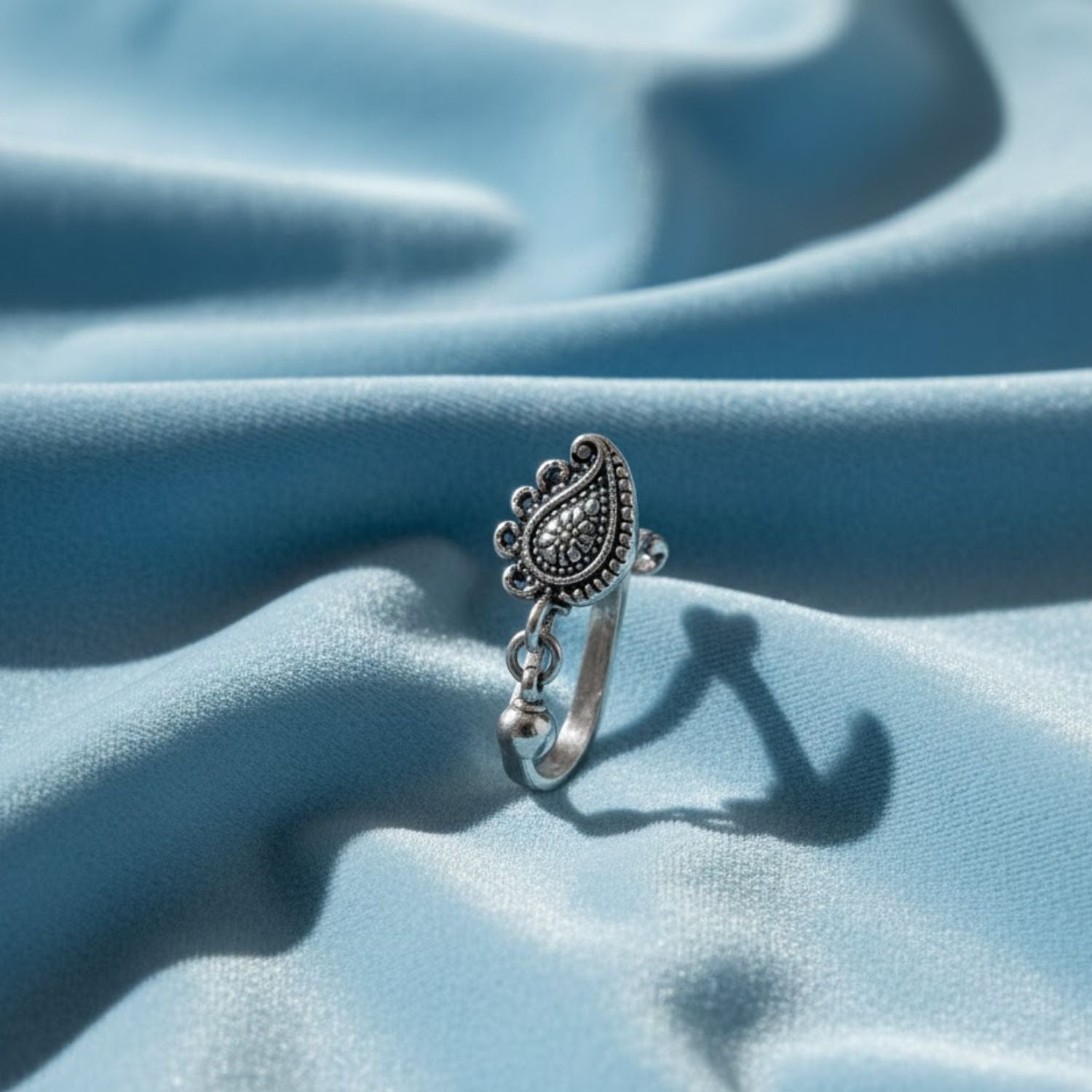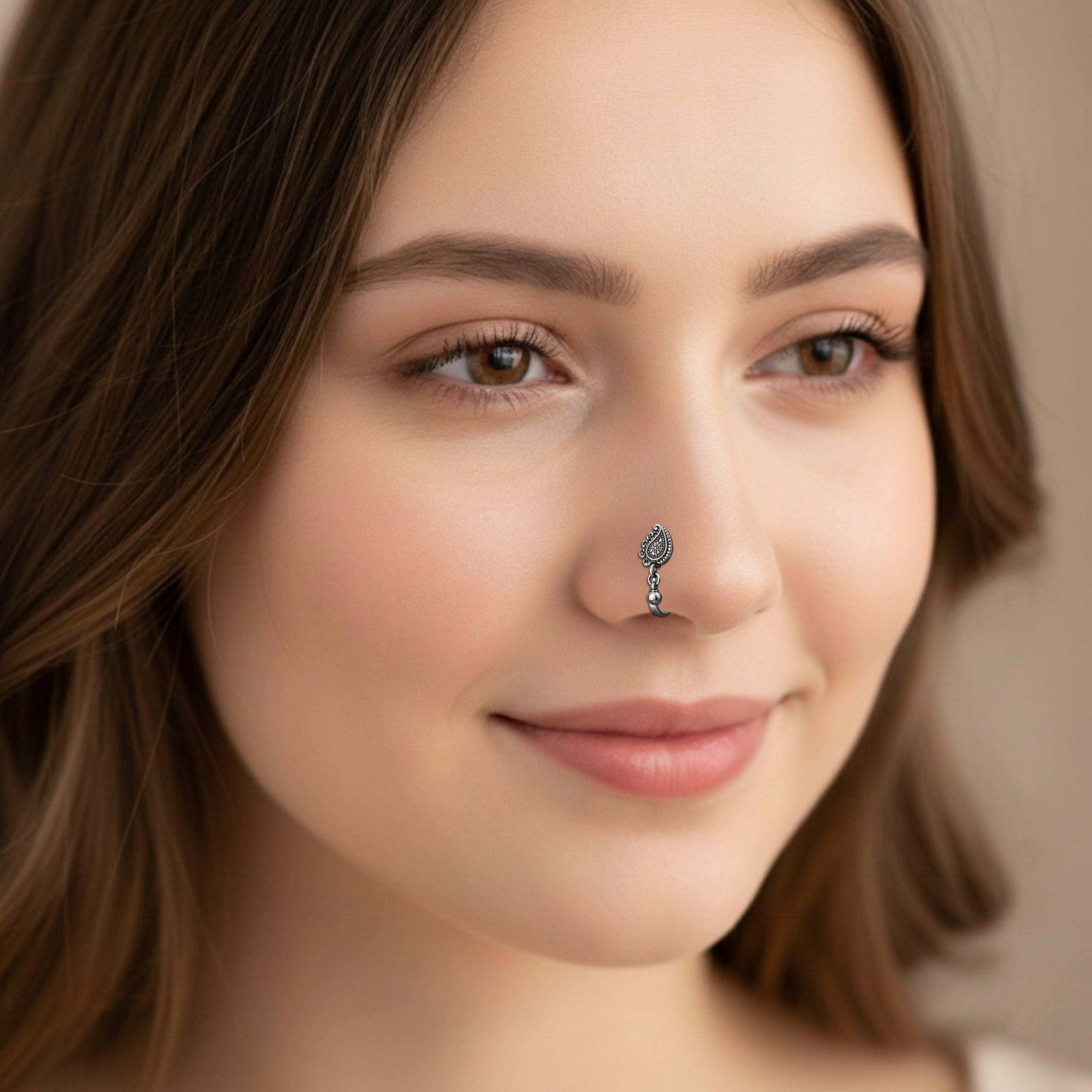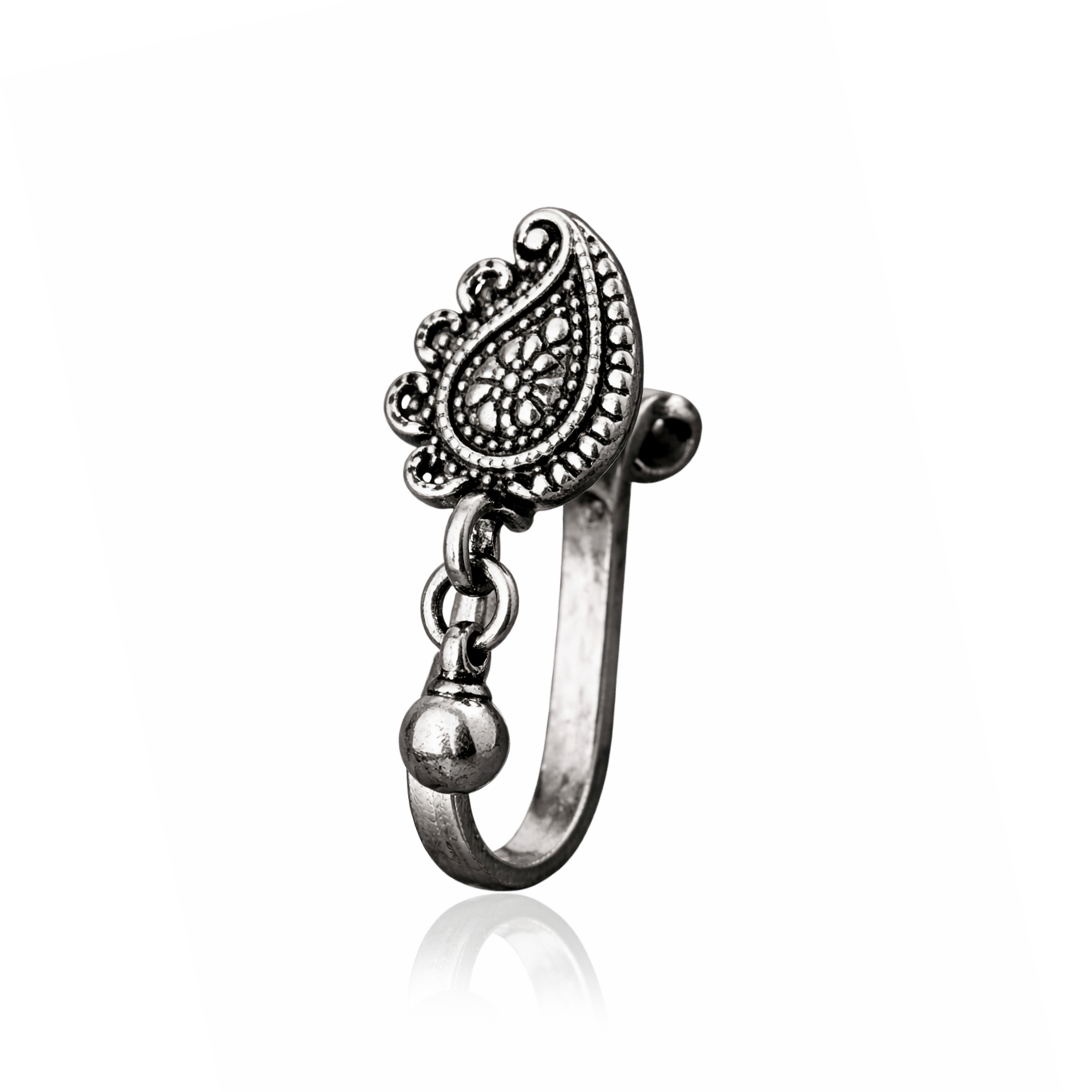 Crafted from genuine 925 sterling silver, this oxidized nose pin features a beautifully carved paisley (mango/teardrop) motif with intricate dotted detailing. The antique finish enhances its traditional handcrafted look, while the attached dangling bead adds a graceful nath-style movement. Perfect for non-pierced wearers, its smooth clip-on design offers comfort and elegance for both festive and daily ethnic styling.