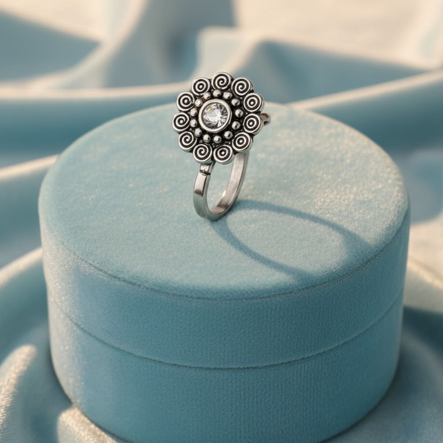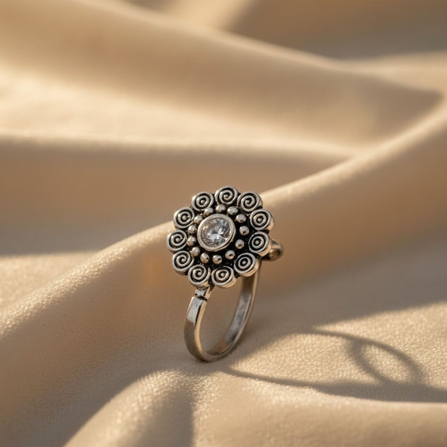 Crafted from genuine 925 sterling silver, this oxidized nose pin features a beautifully detailed spiral floral motif with a sparkling white CZ stone at the center. The antique finish enhances the intricate swirl patterns and beaded detailing, giving it a bold and traditional handcrafted appeal. Designed with a smooth clip-on mechanism, it provides a comfortable fit for non-pierced wearers—perfect for festive, cultural, and everyday ethnic styling.