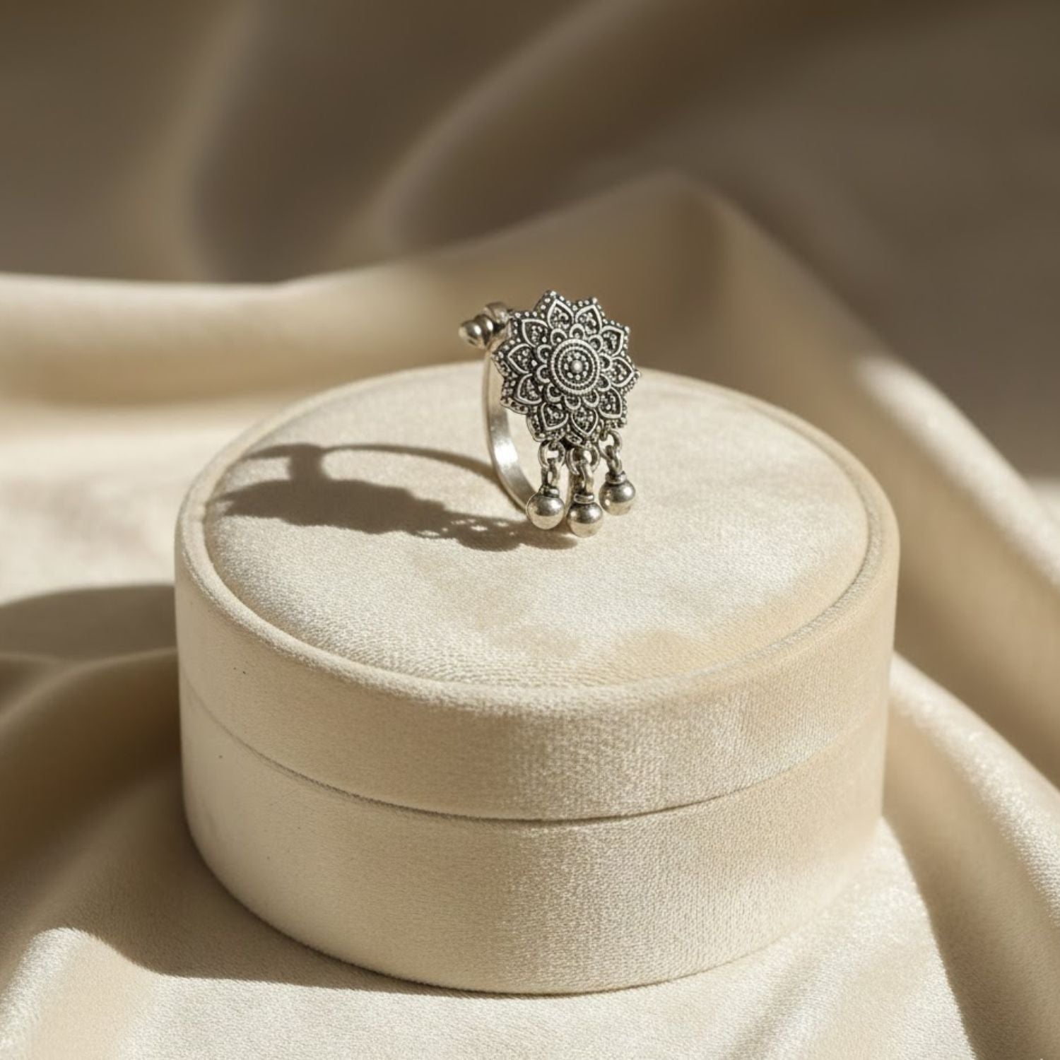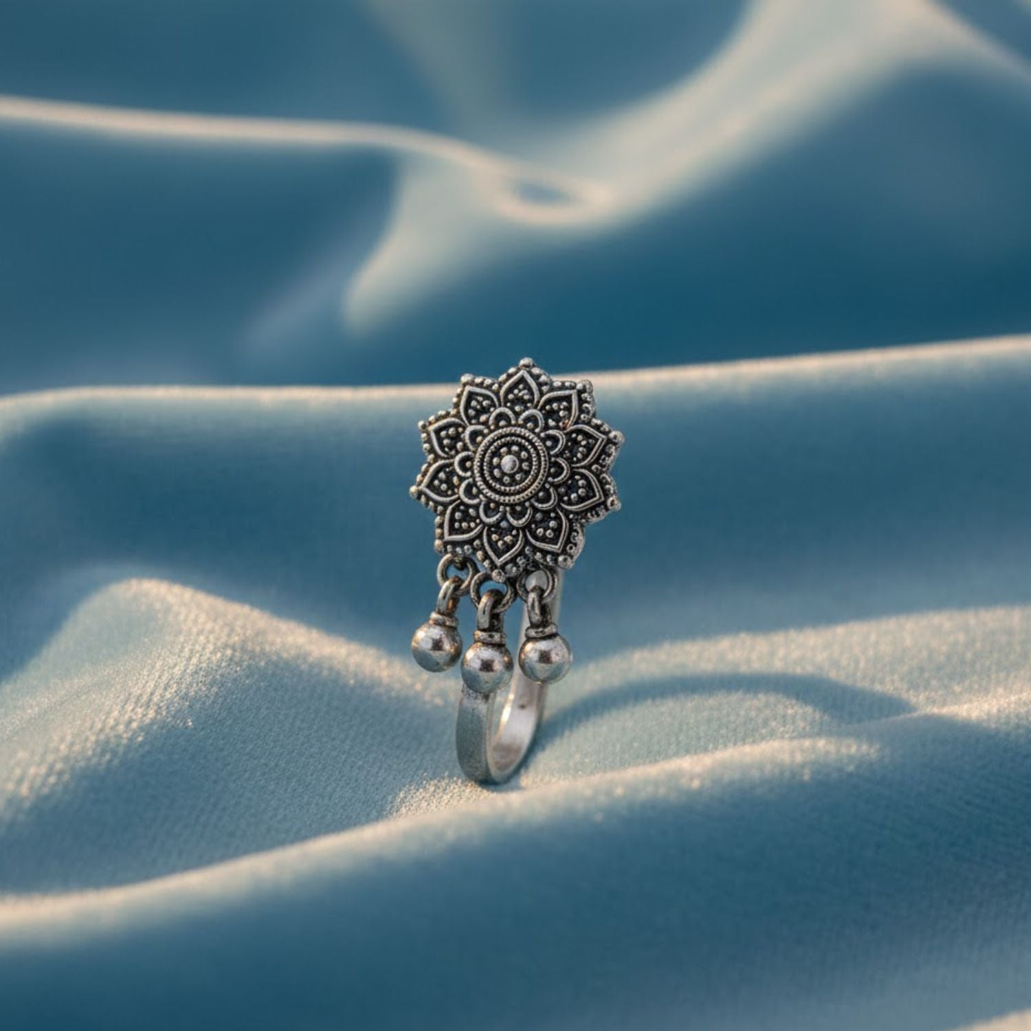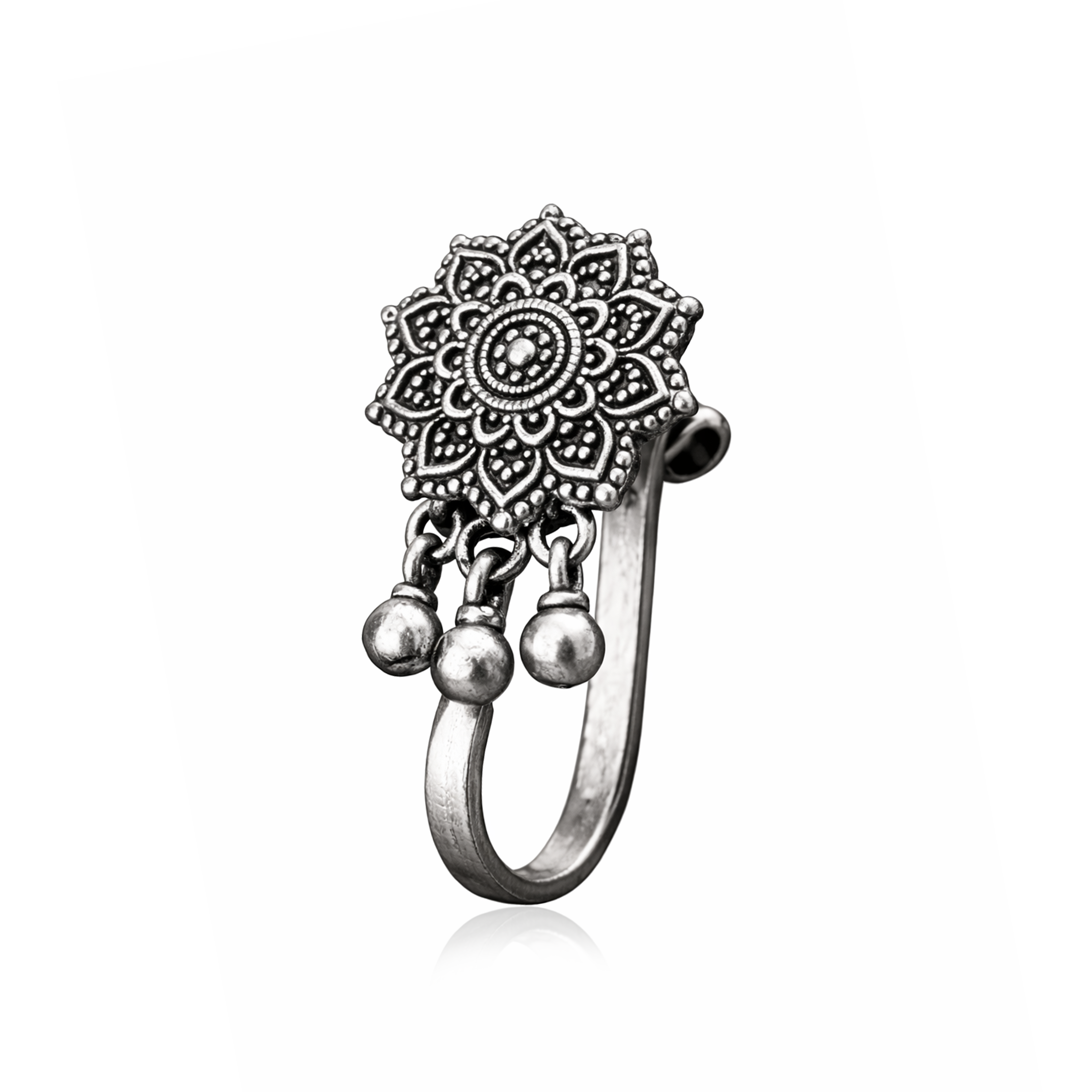 Beautifully crafted in genuine 925 sterling silver, this oxidized nose pin features an intricate mandala-inspired floral motif with detailed dotted work. The antique finish enhances its traditional handcrafted appeal, while the three dangling beads add classic nath-style movement and elegance. Designed with a smooth clip-on mechanism, it provides comfort for non-pierced wearers and completes any ethnic or festive look with timeless charm.
