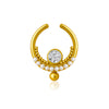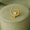 Grace meets tradition in this beautifully crafted septum nose ring made from 925 sterling silver and finished with rich gold plating. The crescent-shaped design features a brilliant white CZ stone at the center, framed with delicate pearls and fine bead detailing. Perfect for festive occasions, weddings, or cultural events, this piece adds a refined touch of ethnic beauty to your look.