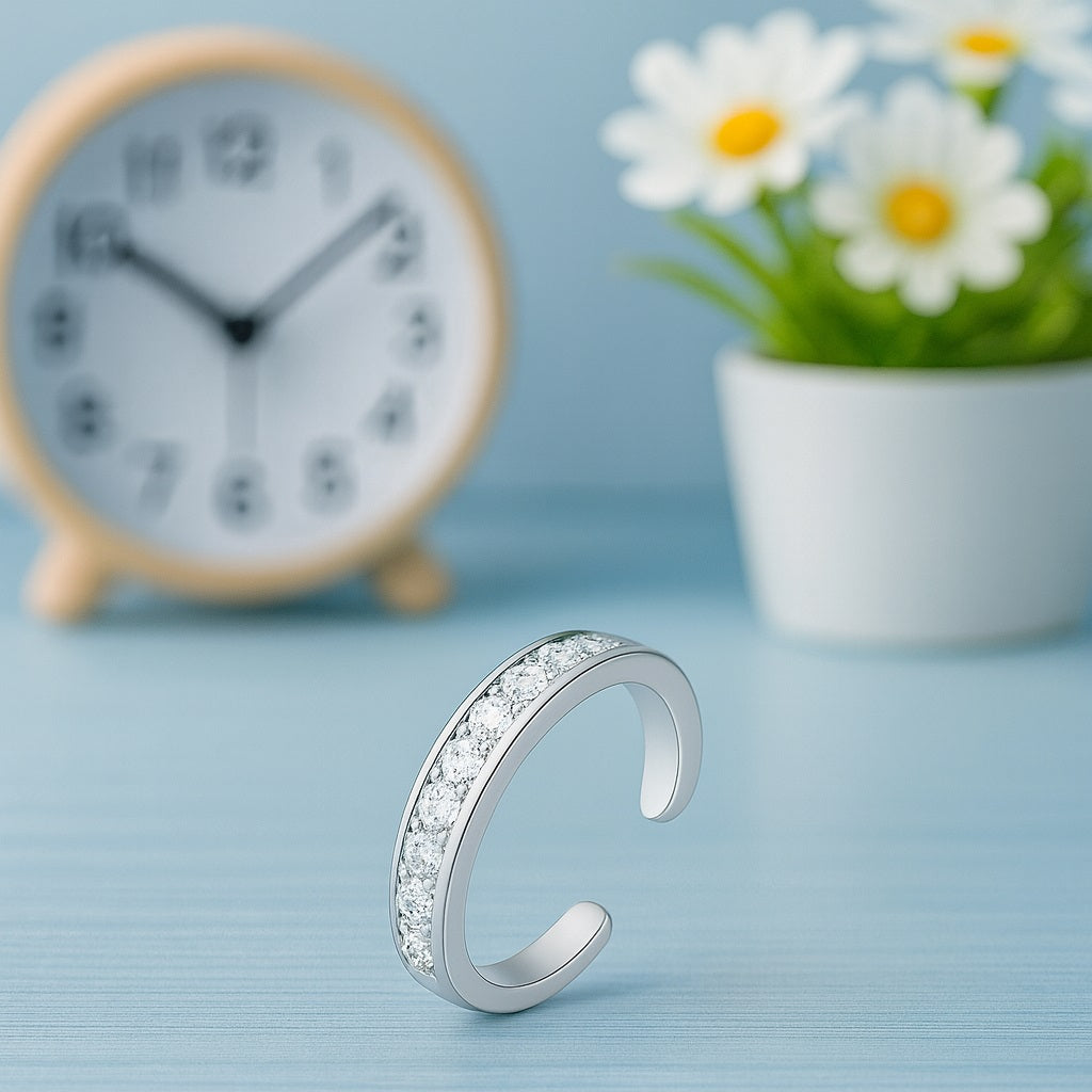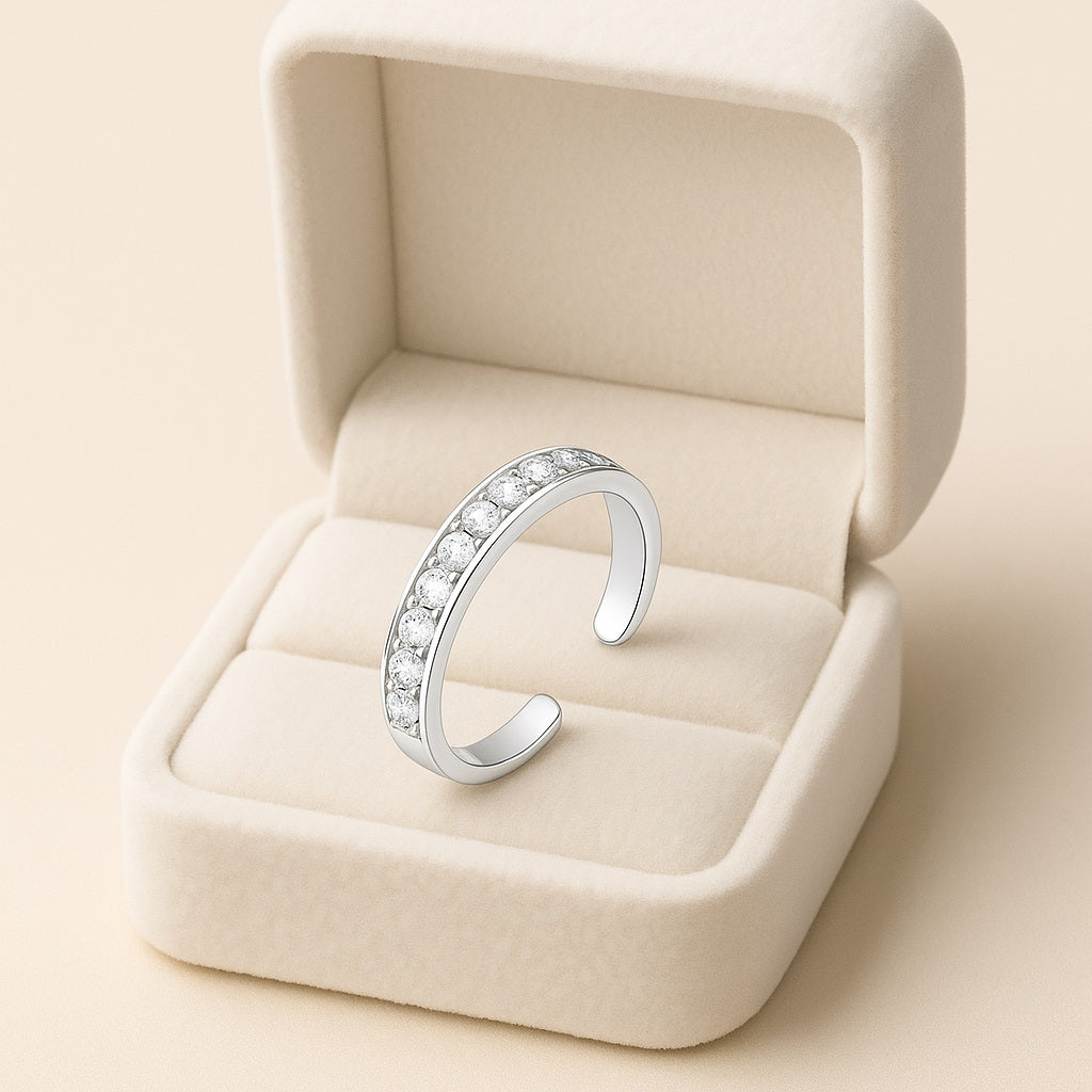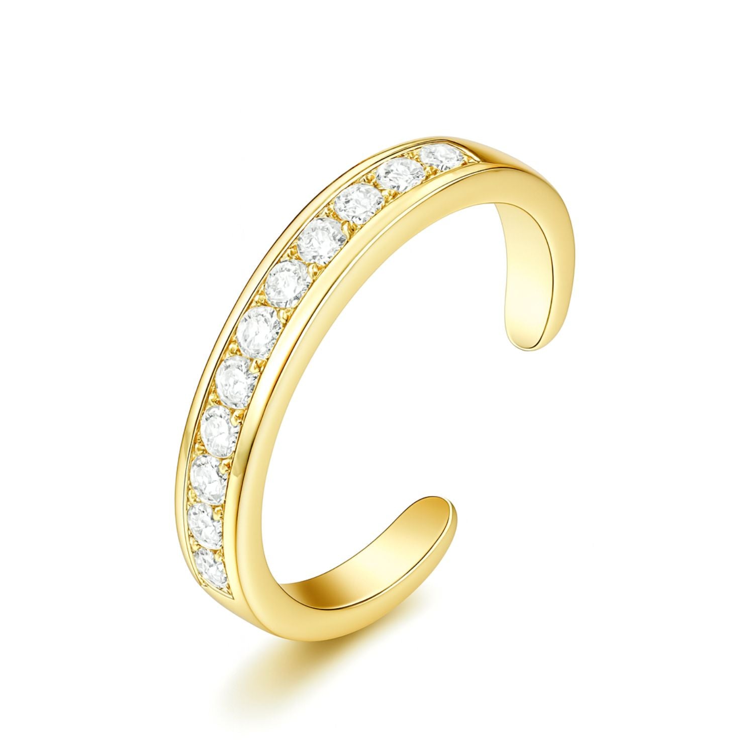 This elegant toe ring features a sleek open-band design crafted with a luxurious yellow gold-plated finish. The front is beautifully lined with sparkling round-cut cubic zirconia stones in a secure channel setting, offering a refined and modern look. Adjustable and comfortable, this toe ring is perfect for daily wear, holiday outfits, weddings, or adding a touch of glam to any summer style.