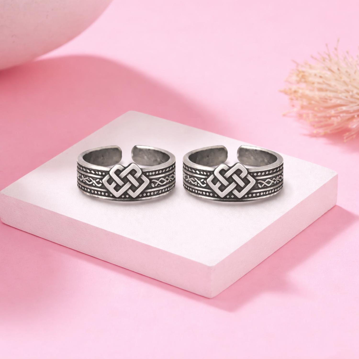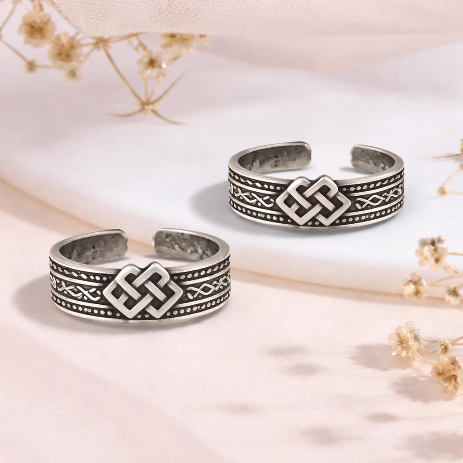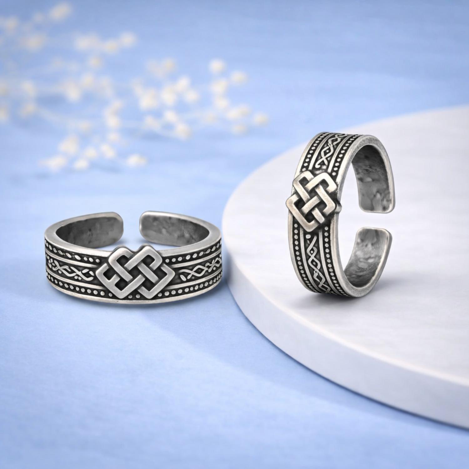 This elegant toe ring features a classic Celtic knot motif crafted in solid 925 sterling silver, symbolizing eternity and interconnectedness. Accented with an oxidized engraved band, the adjustable open design ensures a comfortable fit while adding a bold yet refined tribal appeal. Perfect for everyday wear, boho styling, or meaningful gifting.