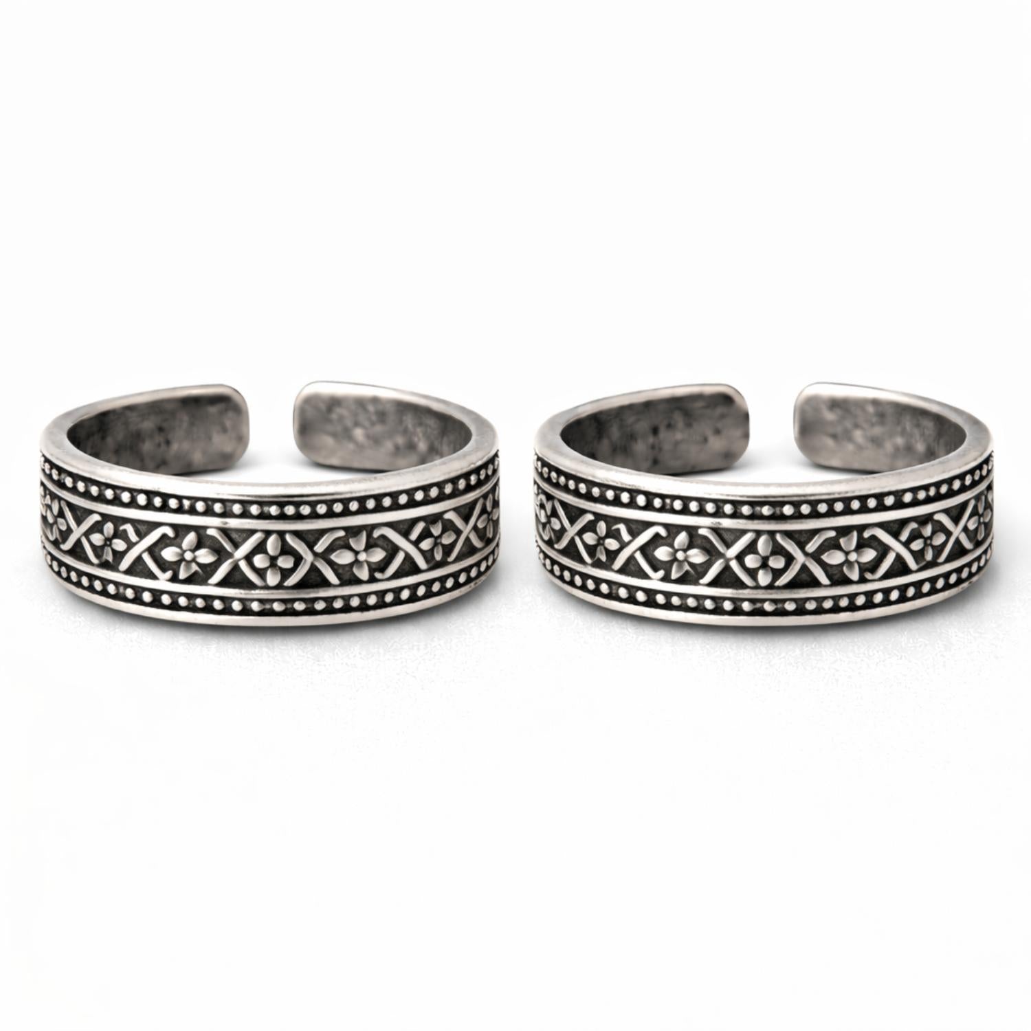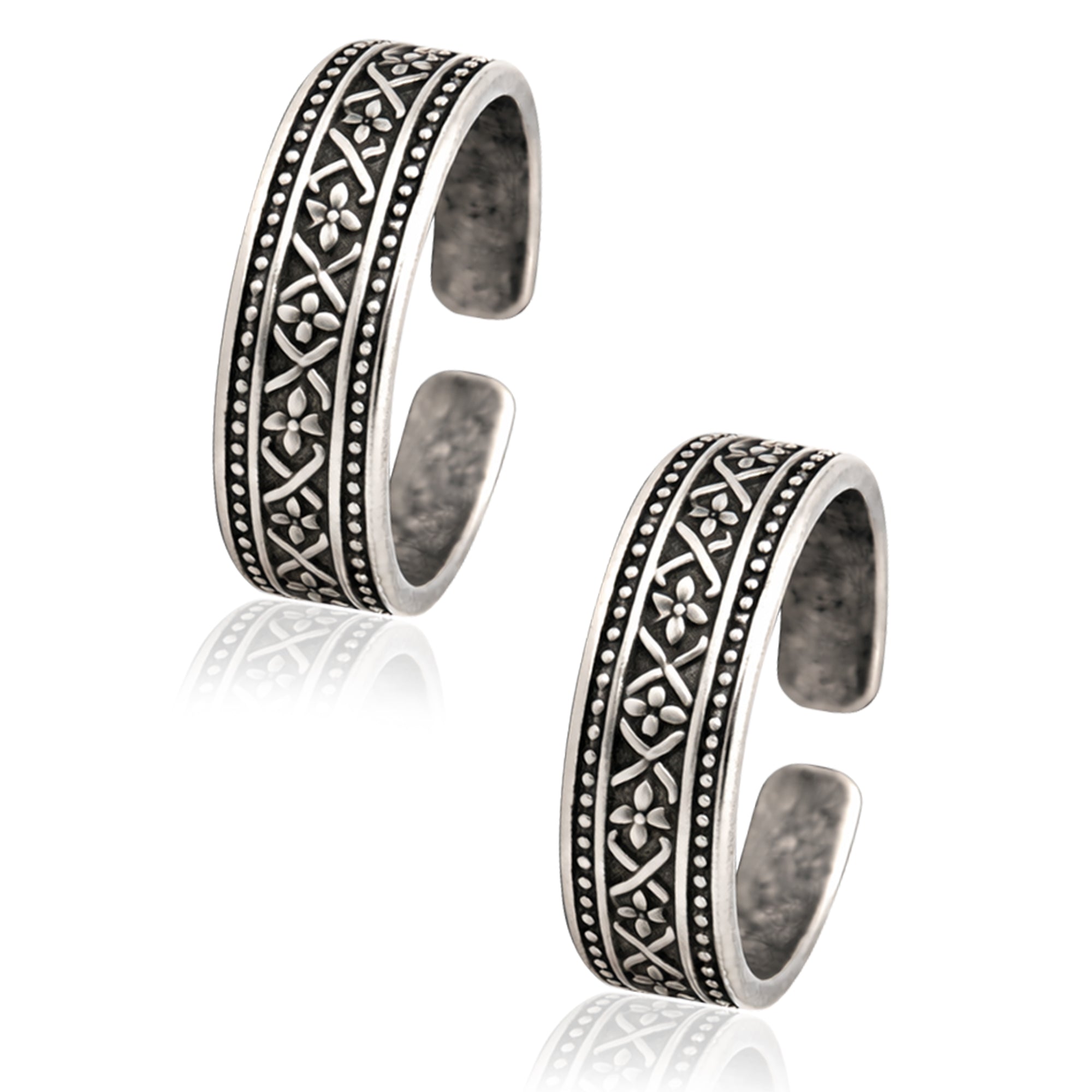 This elegant toe ring showcases a finely engraved floral lattice pattern framed by dotted borders, inspired by traditional Indian silver artistry. Crafted in solid 925 sterling silver with an oxidized finish, the design offers depth, contrast, and a timeless ethnic appeal. The open adjustable band ensures a comfortable and secure fit for everyday or festive wear.