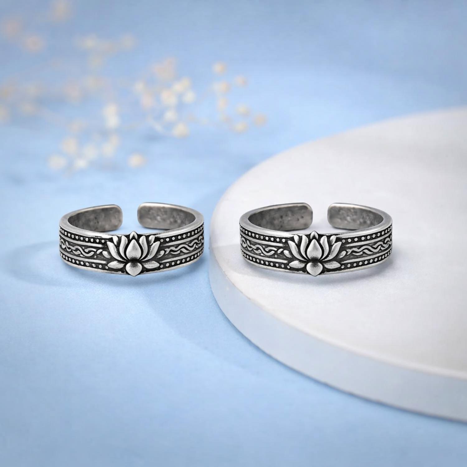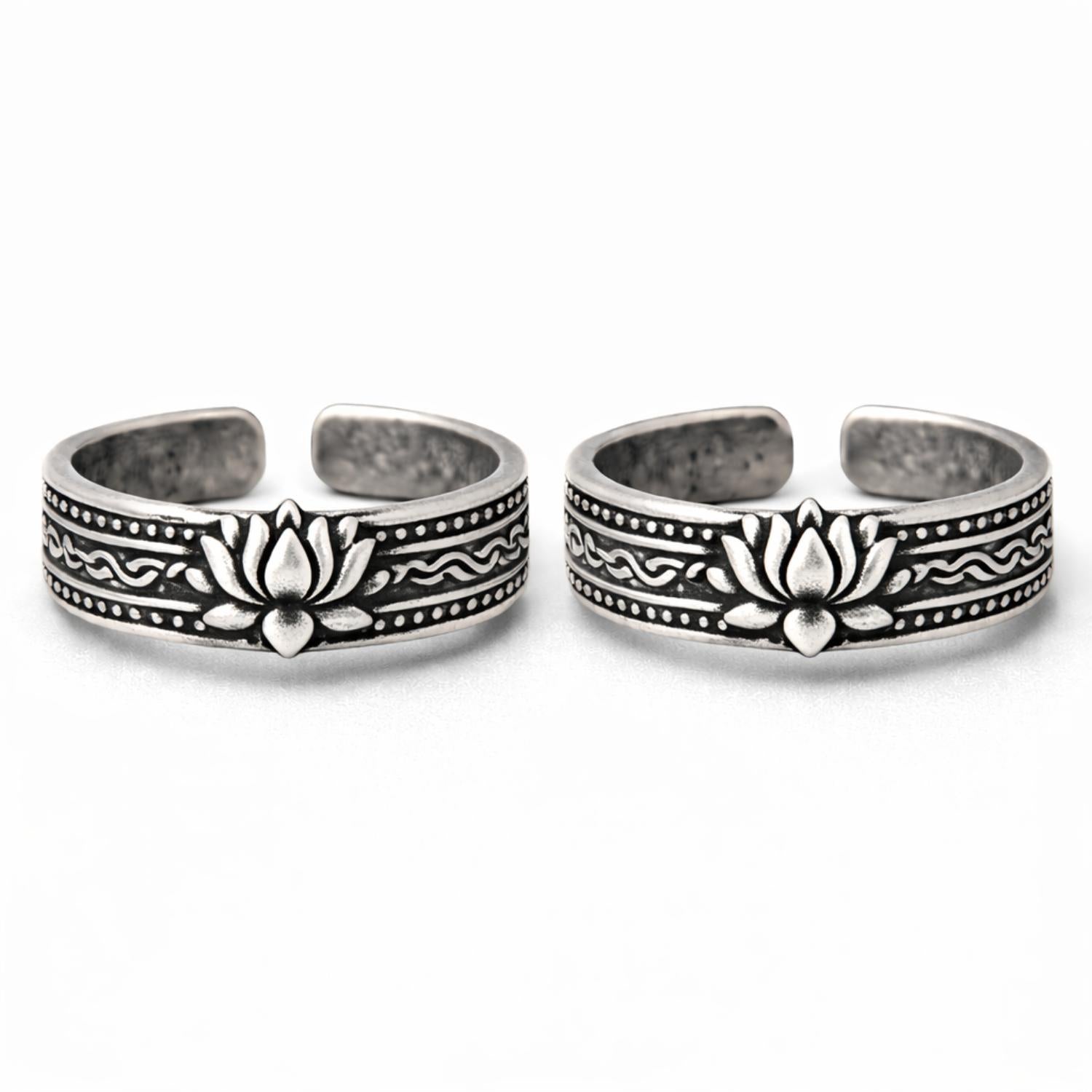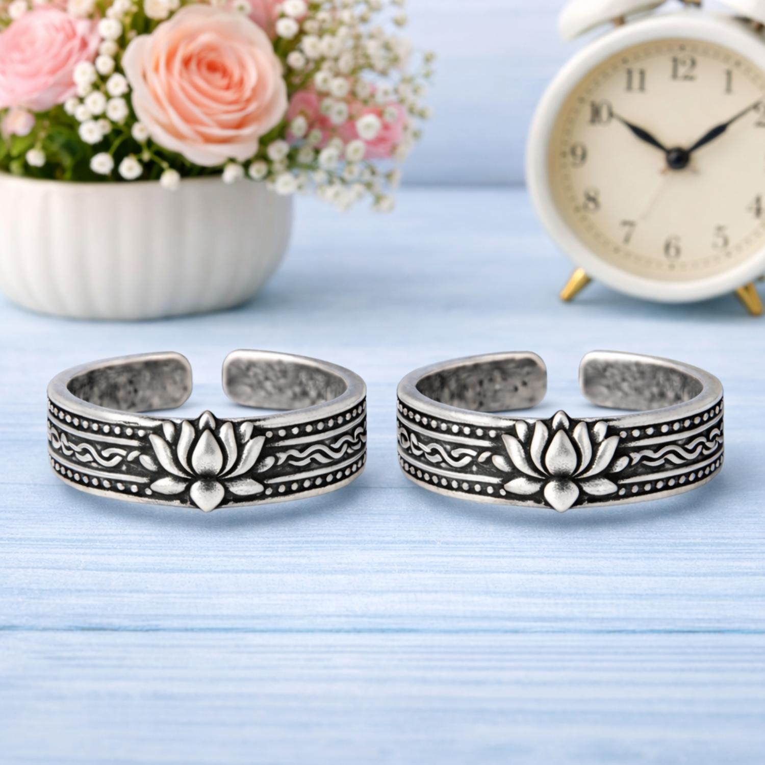 Inspired by the timeless beauty of the lotus flower, this oxidized toe ring features a finely sculpted lotus motif set on an engraved ethnic band. Crafted in solid 925 sterling silver with an antique oxidized finish, the adjustable open design ensures a comfortable fit while adding a graceful traditional touch to everyday or festive looks.