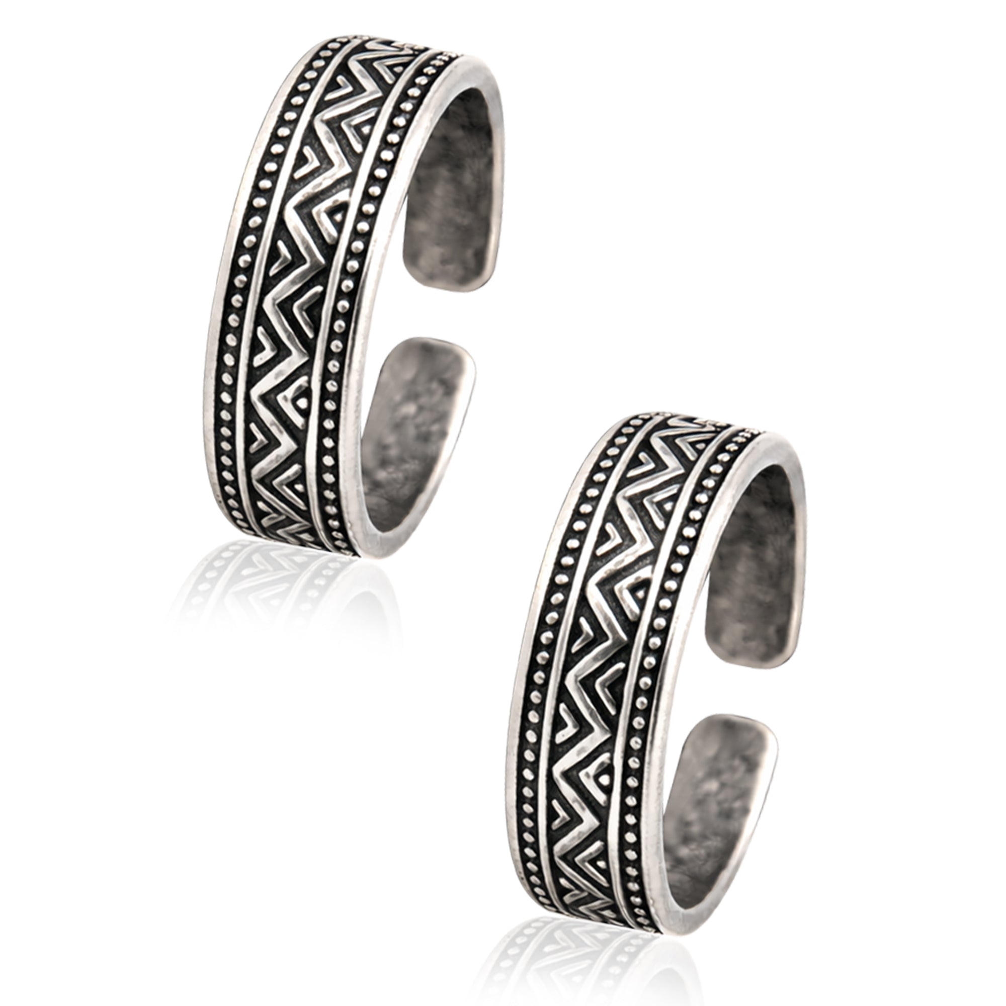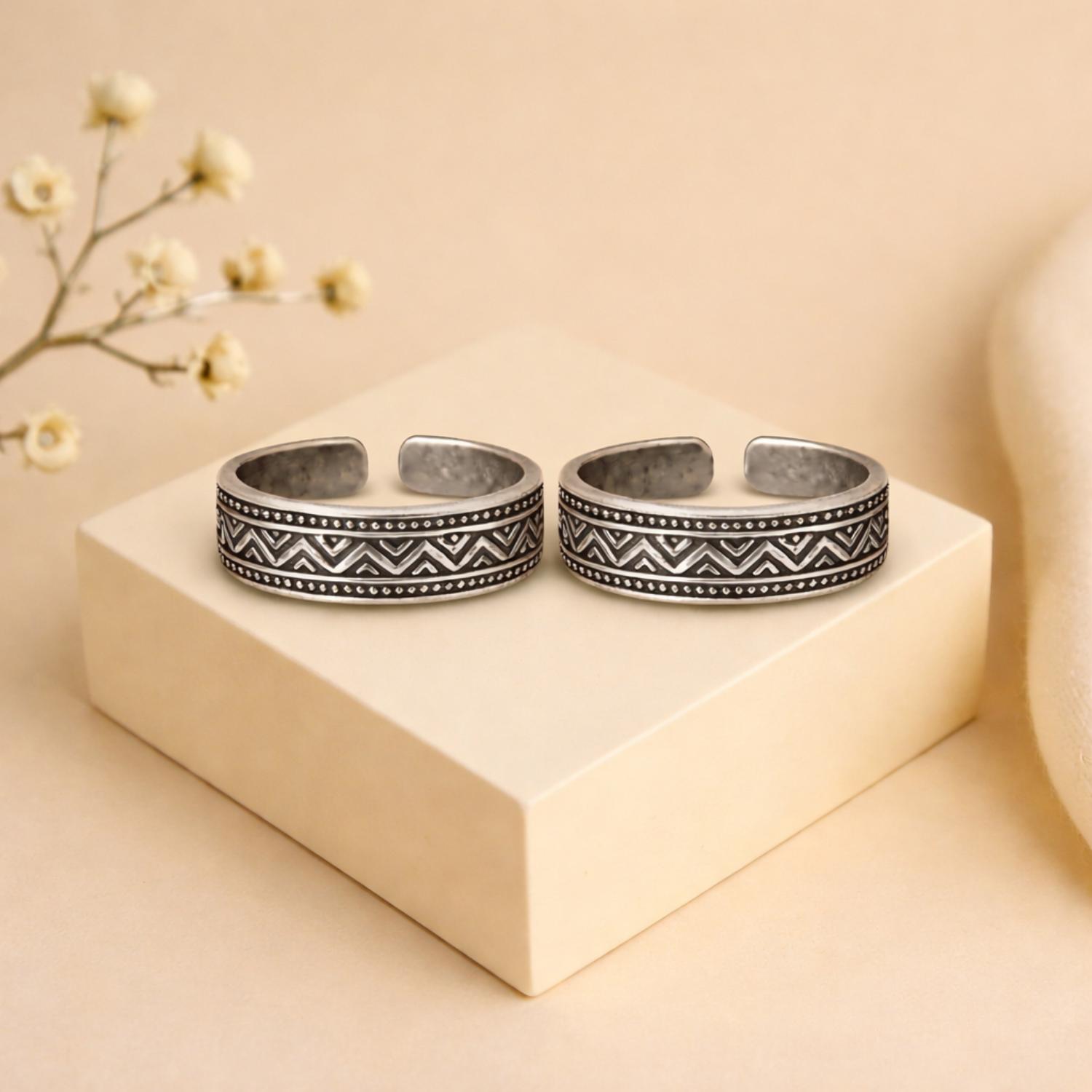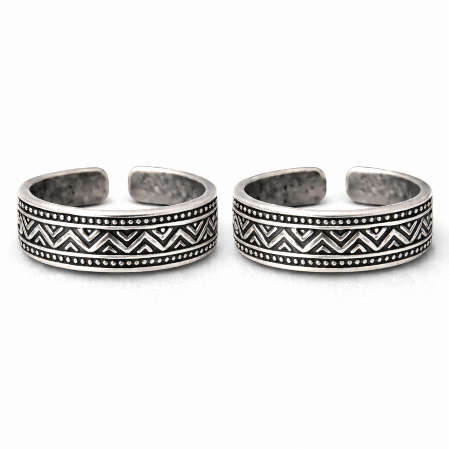 This handcrafted toe ring features a bold zigzag engraved pattern framed by fine dotted borders, creating a striking yet balanced tribal look. Made from solid 925 sterling silver with an oxidized finish, the design highlights detailed craftsmanship while remaining versatile for daily wear. The open adjustable band ensures a comfortable and secure fit on any toe.