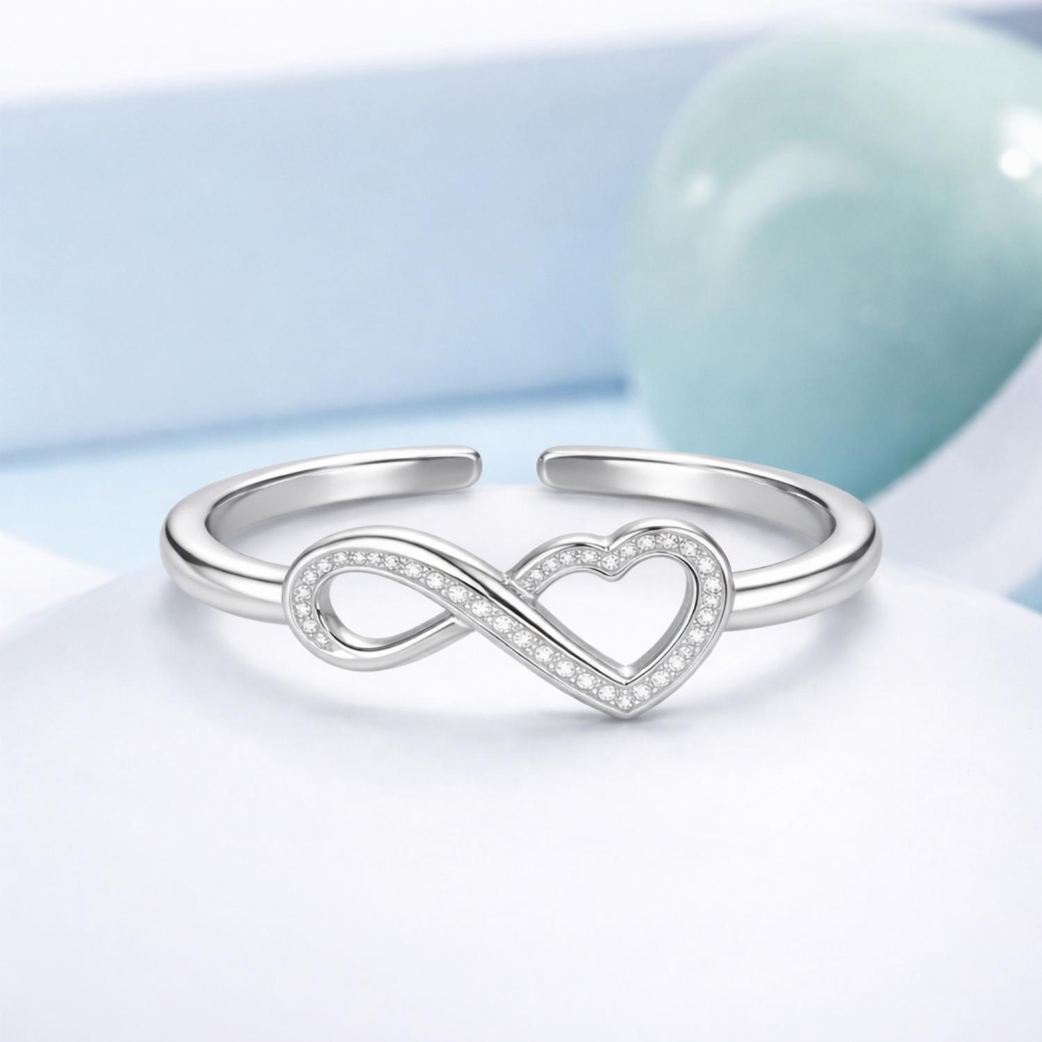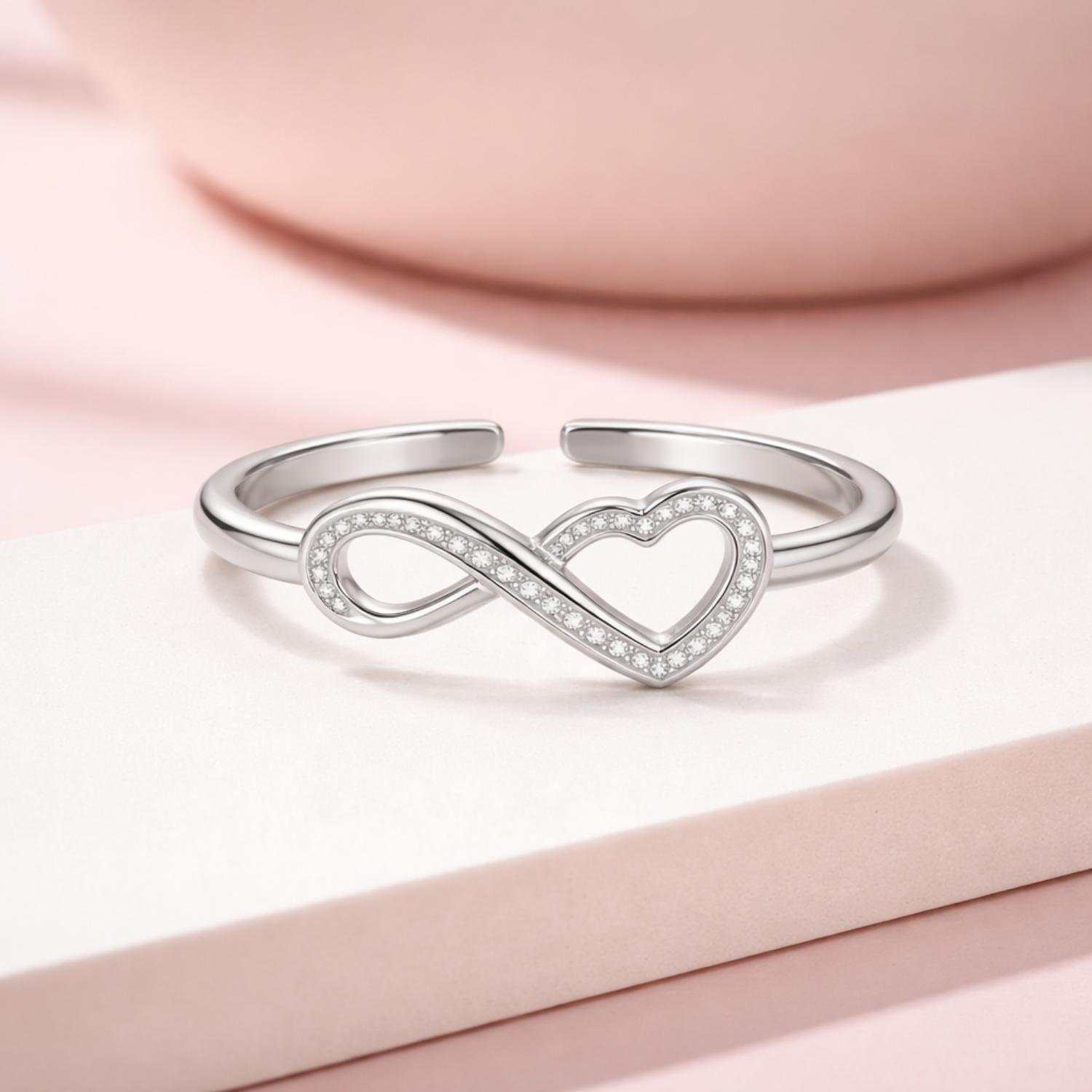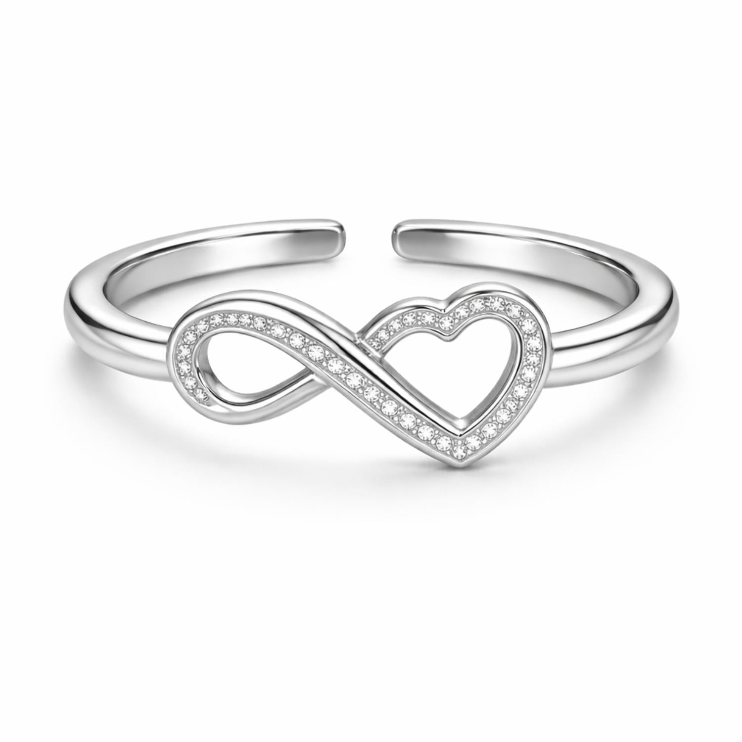 This beautifully crafted ring combines an infinity loop with a sparkling heart, representing endless love and connection. Set in polished 925 sterling silver and highlighted with CZ stones, this open band ring delivers timeless elegance with modern symbolism.