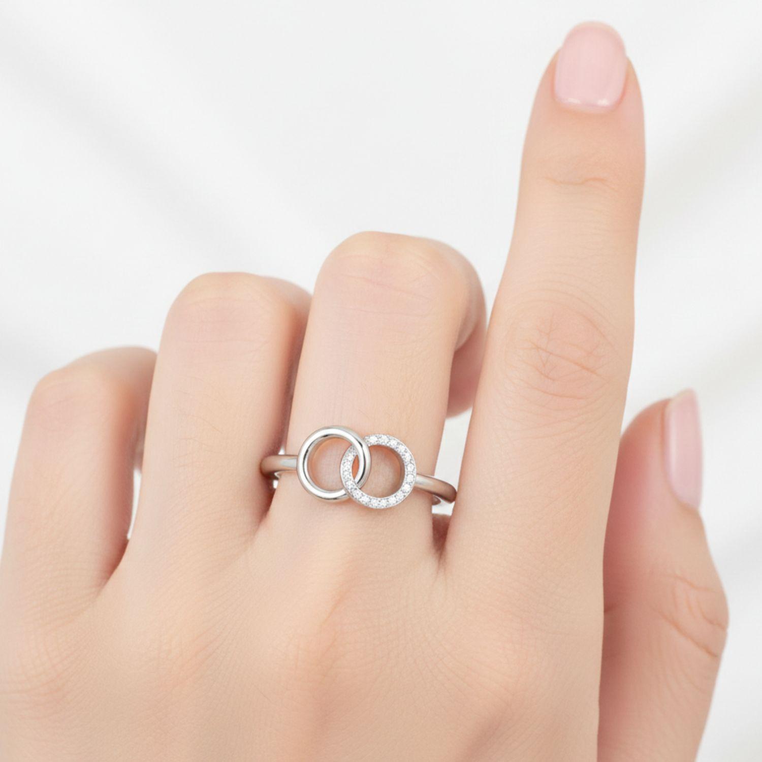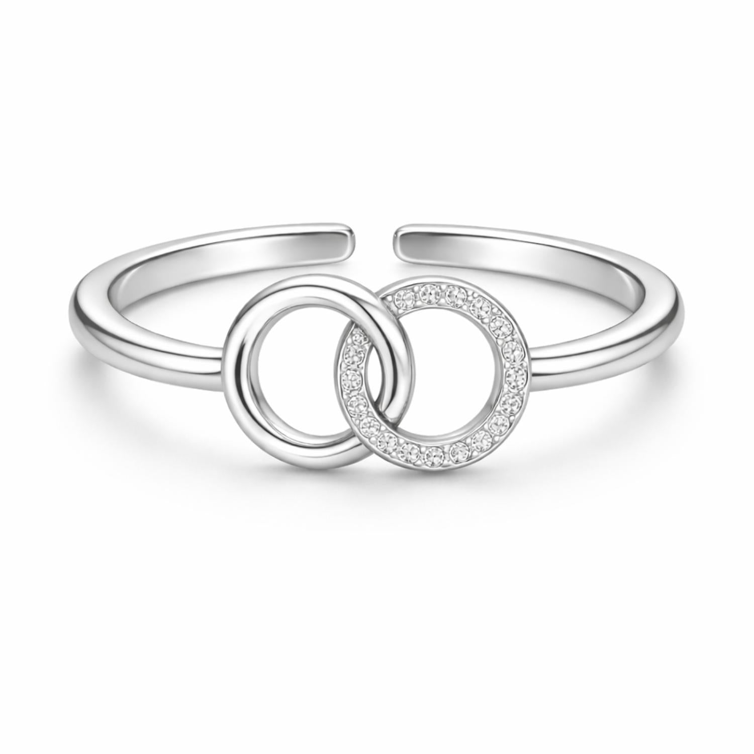 This elegant open ring features two interlocking circles, one polished and one accented with sparkling cubic zirconia, symbolizing unity and everlasting connection. Crafted in solid 925 sterling silver, the sleek open band offers a refined look perfect for everyday elegance.