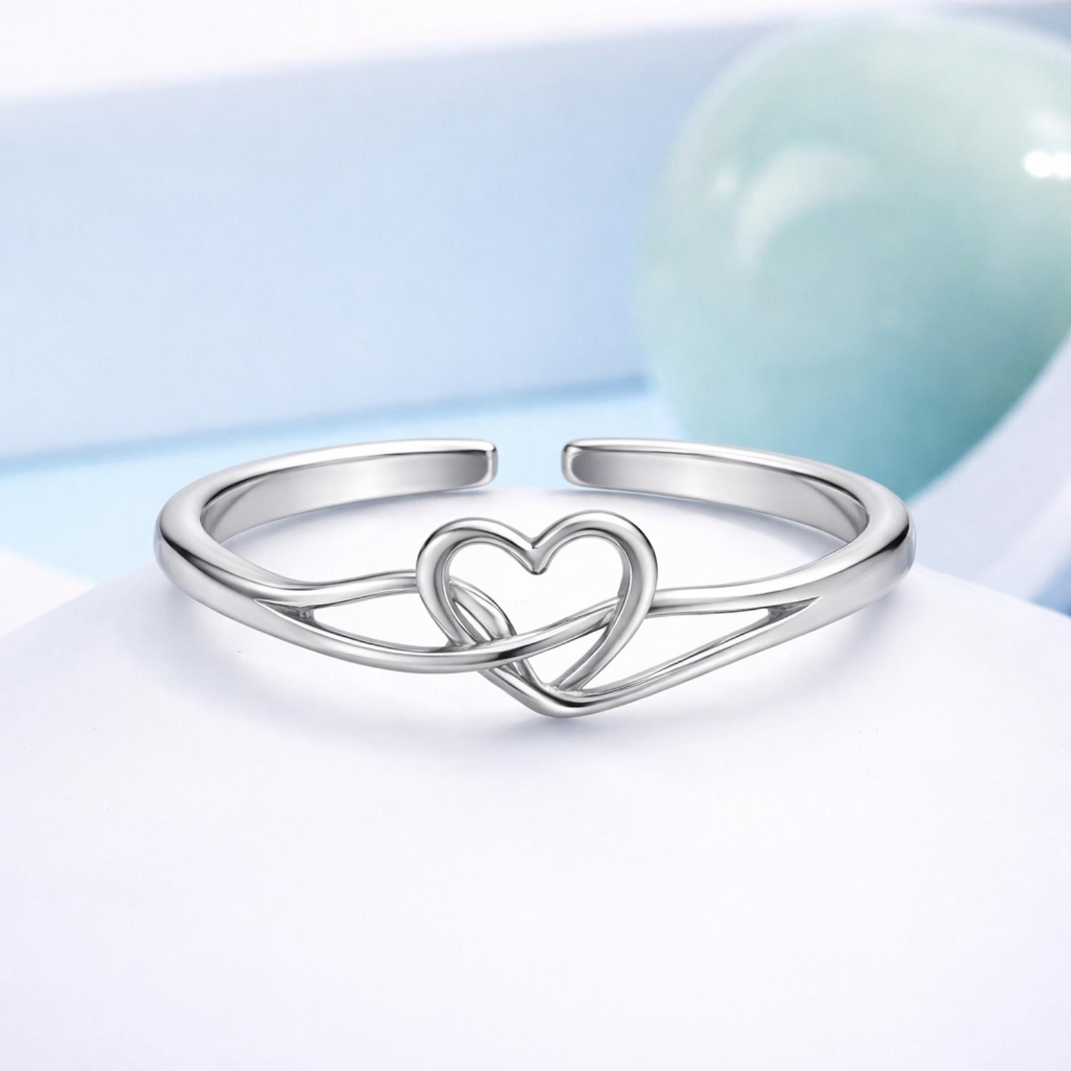 This refined open ring showcases an intertwined heart design symbolizing unity and emotional bonding. Crafted in smooth, high-polish 925 sterling silver, the flowing lines create a modern yet timeless look perfect for everyday elegance.