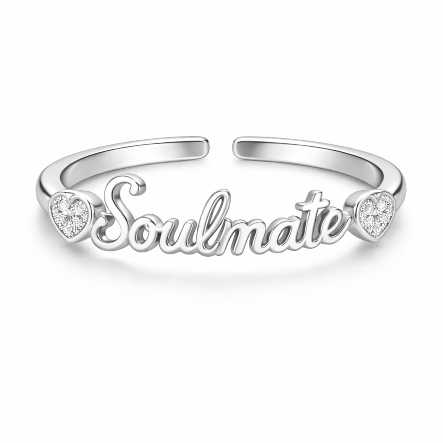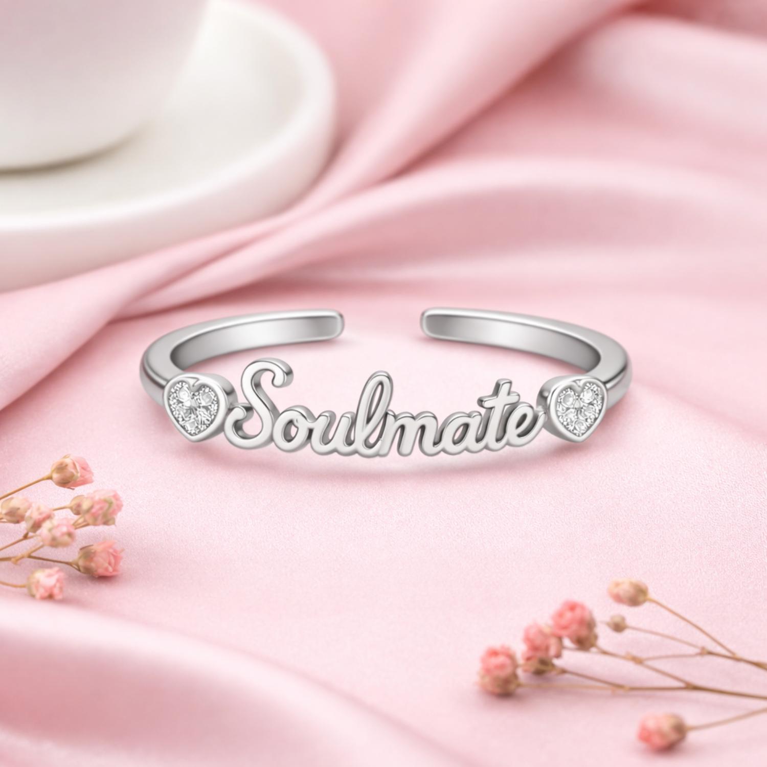 Designed to celebrate true connection, this open ring features elegant “Soulmate” script accented with sparkling CZ heart details on each side. Crafted in solid 925 sterling silver, it blends romance with a graceful modern look.
