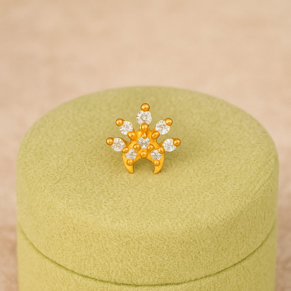 Grace your look with this majestic crescent-shaped nose pin, handcrafted in 925 sterling silver and finished in gleaming gold plating. Embellished with shimmering white CZ stones in a radiating crown pattern, this design captures a timeless royal elegance with a hint of contemporary charm. Ideal for festive, bridal, or statement ethnic wear.