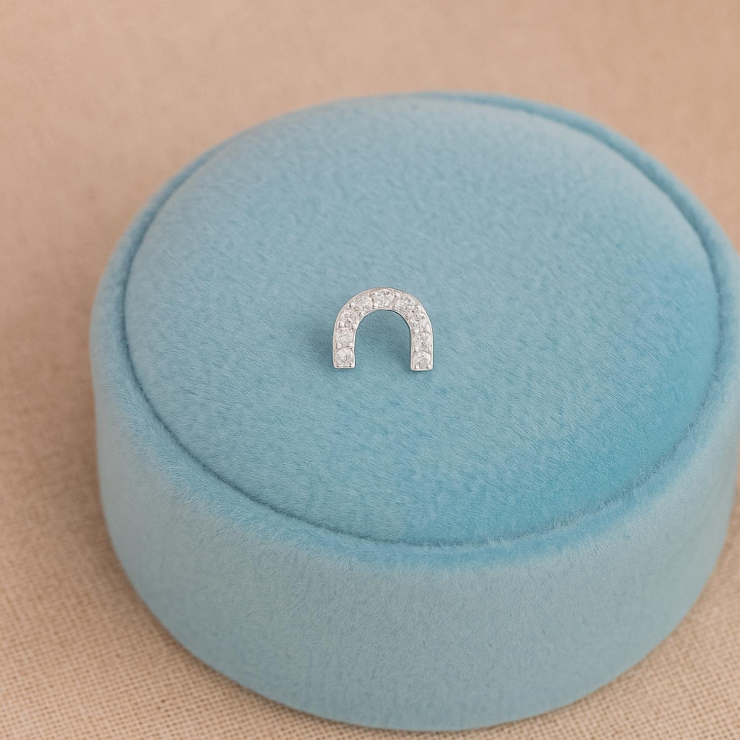 Designed in a sleek U-shape, this sterling silver nose pin is encrusted with sparkling white CZ stones for a touch of understated glamour. The curved horseshoe silhouette adds a symbolic charm of luck and protection, making it both fashionable and meaningful. Crafted from solid 925 silver, this piece is perfect for minimalist lovers seeking everyday sparkle.