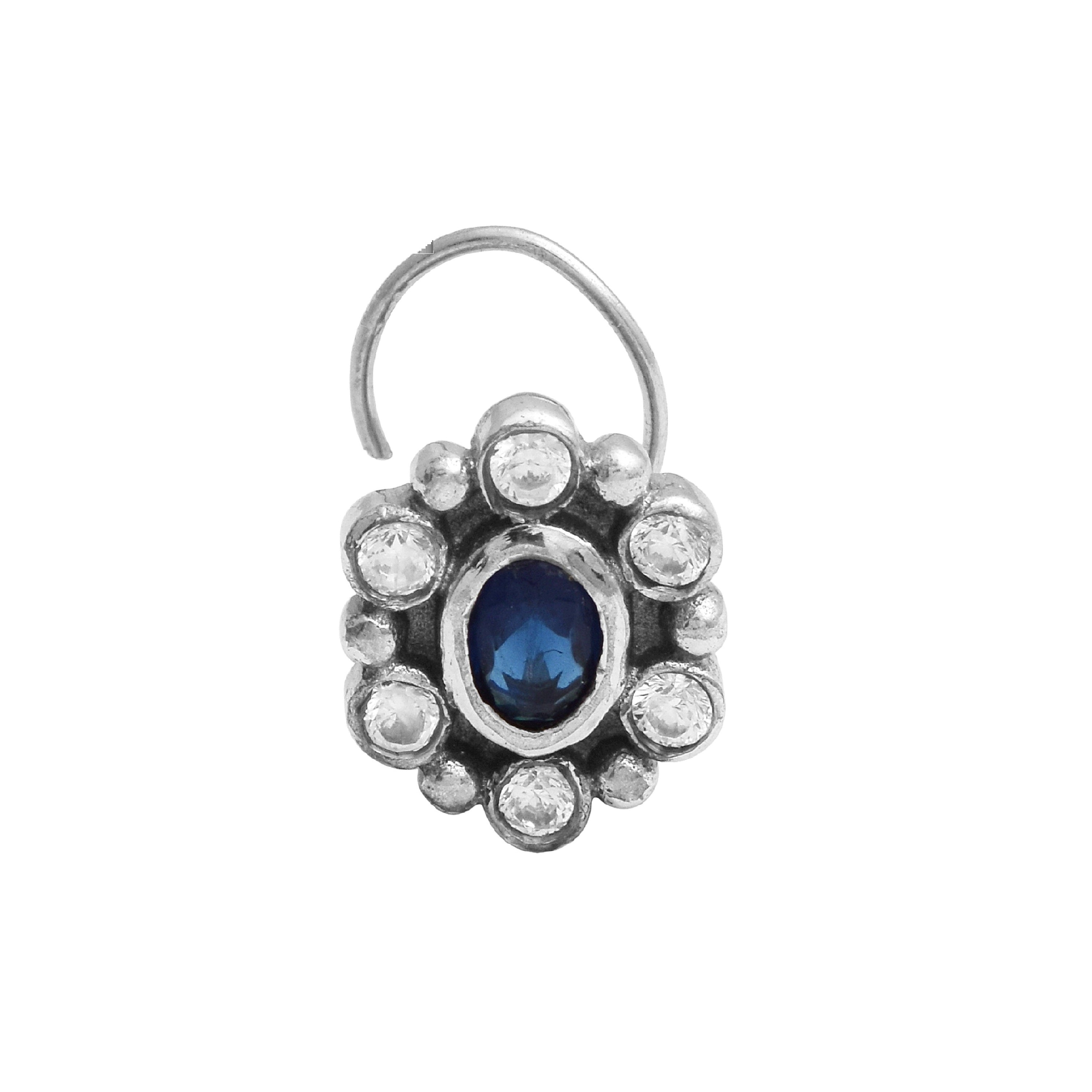 Celebrate traditional beauty with this charming floral nose pin, crafted in oxidized 925 sterling silver. The center features an oval-cut blue cubic zirconia surrounded by a radiant halo of round white CZ stones, forming a classic flower-inspired cluster. Perfect for those who love heritage designs with a colorful twist.