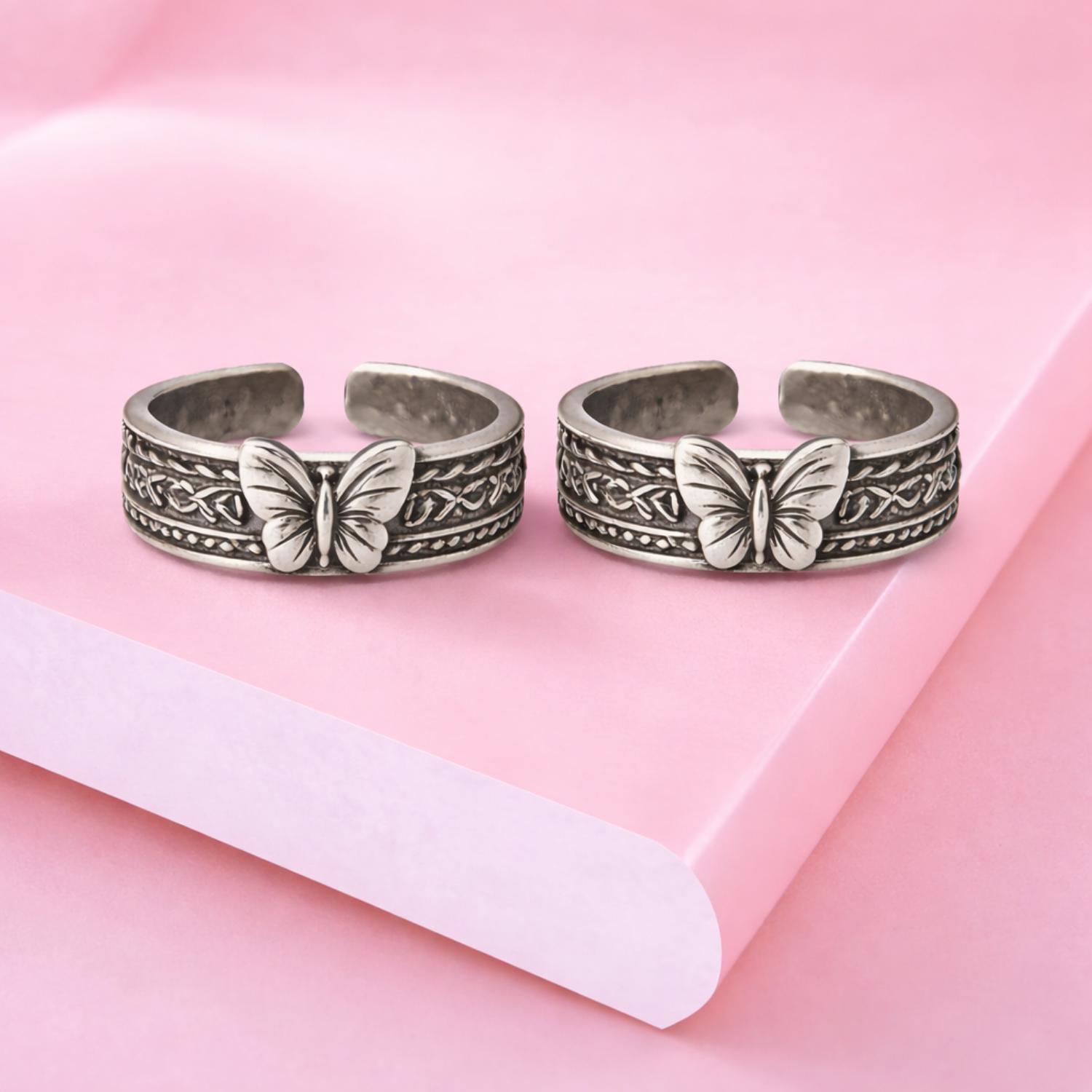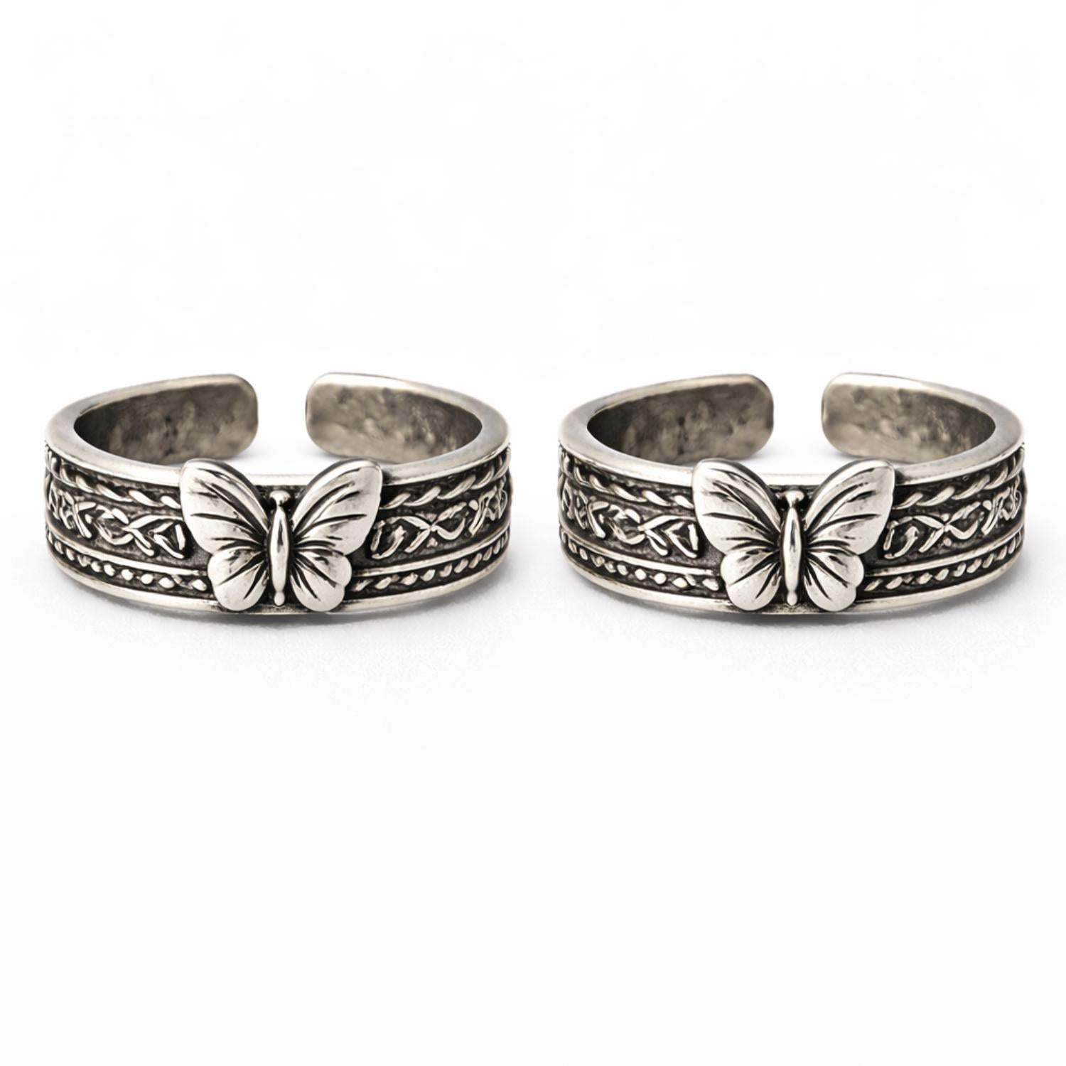 Inspired by nature’s beauty, this toe ring features a finely detailed butterfly motif set on an oxidized engraved band. Crafted from solid 925 sterling silver, the antique finish highlights the intricate craftsmanship while offering a timeless ethnic appeal. The adjustable open band ensures a comfortable fit for everyday wear.