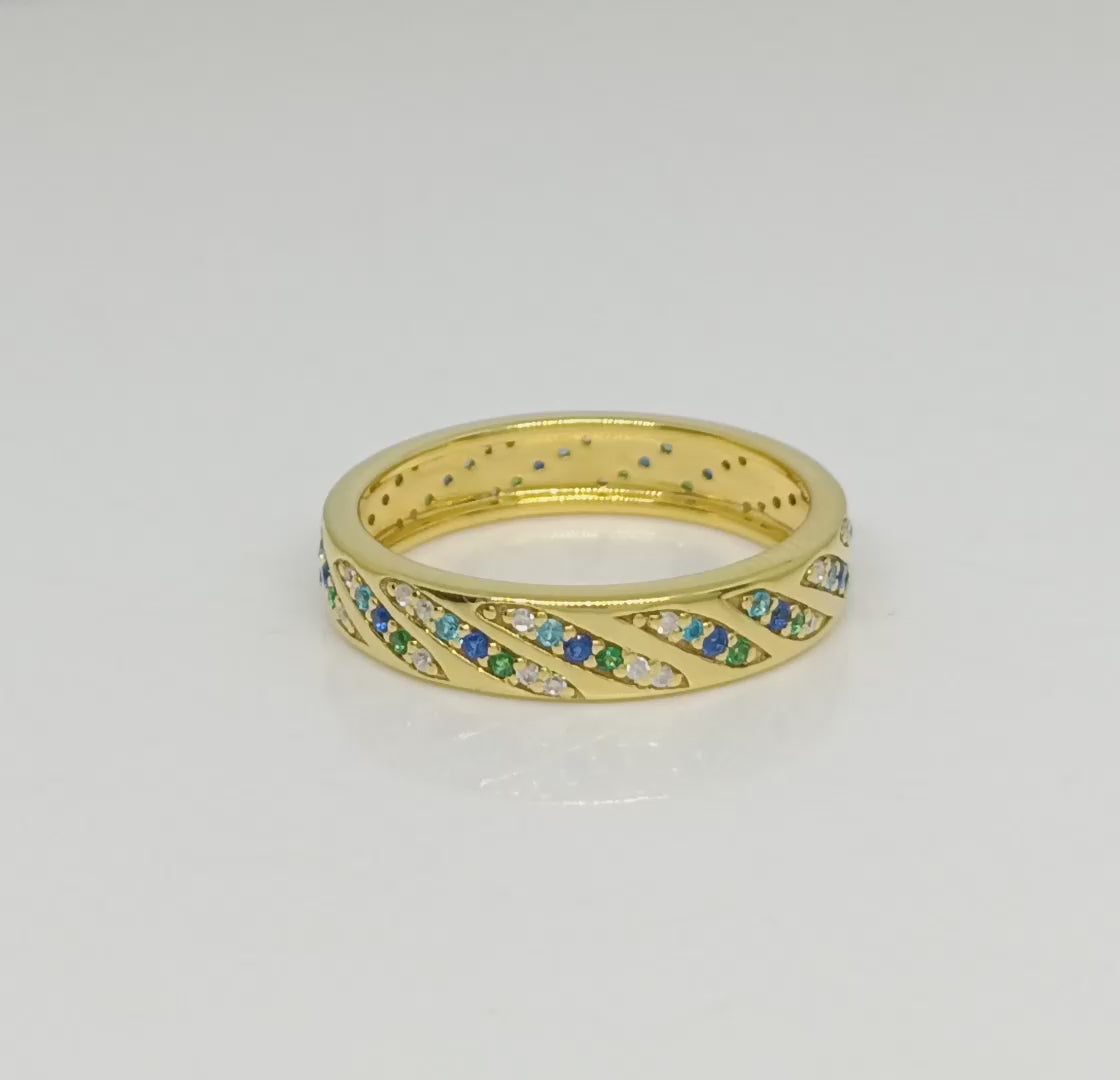 This stylish band ring is crafted in gold-plated 925 sterling silver and features a vibrant mix of blue, green, and white CZ stones set in elegant diagonal pavé channels. The colorful pattern adds a refreshing sparkle, while the smooth comfort-fit inner band ensures effortless daily wear. Perfect for stacking or wearing solo, this ring blends modern elegance with a playful pop of color.