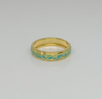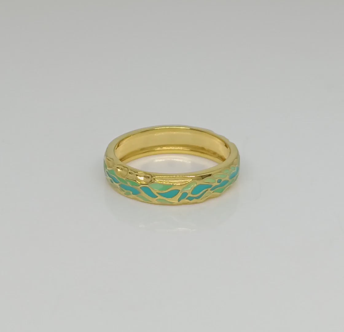 This elegant band ring features a beautiful fusion of gold-plated 925 sterling silver and vibrant turquoise enamel, creating a refreshing leaf-inspired pattern around the band. The smooth enamel detailing paired with the textured metalwork gives the ring a modern yet artistic appeal. Lightweight, stylish, and perfect for everyday wear, it adds a pop of color and sophistication to any look.