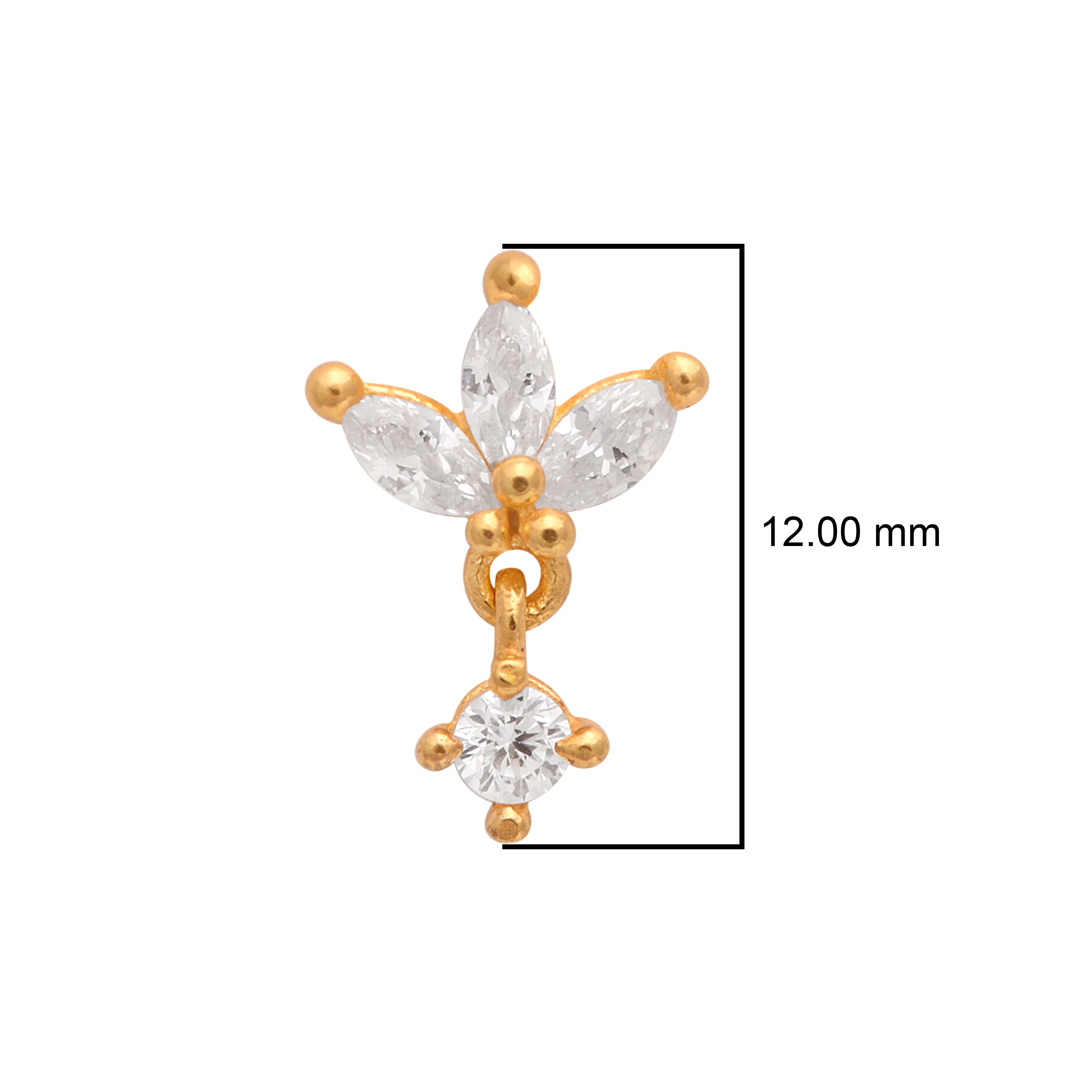 Elevate your style with this dainty nose pin crafted in 925 sterling silver and luxuriously gold-plated. Featuring a trio of marquise-cut white CZ stones arranged in a blooming leaf cluster, it’s finished with a petite dangling round CZ charm that sways with every movement. A perfect blend of femininity and sparkle, ideal for festive and everyday glam.