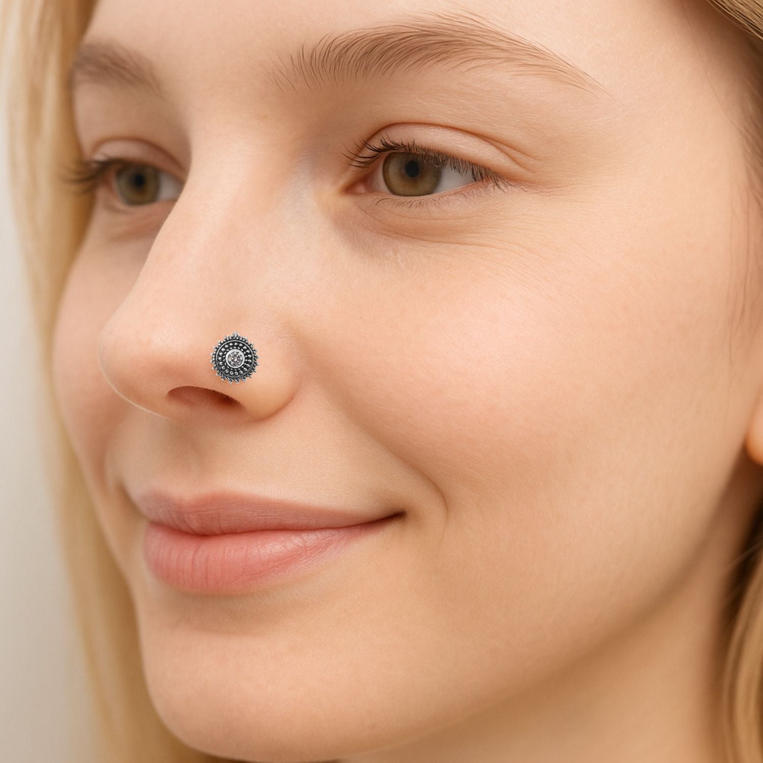 Celebrate classic Indian artistry with this handcrafted oxidized 925 silver nose pin featuring a rich white cubic zirconia at its center. The circular granulated mandala design exudes heritage charm, making it perfect for cultural celebrations, festive attire, or traditional daily wear.